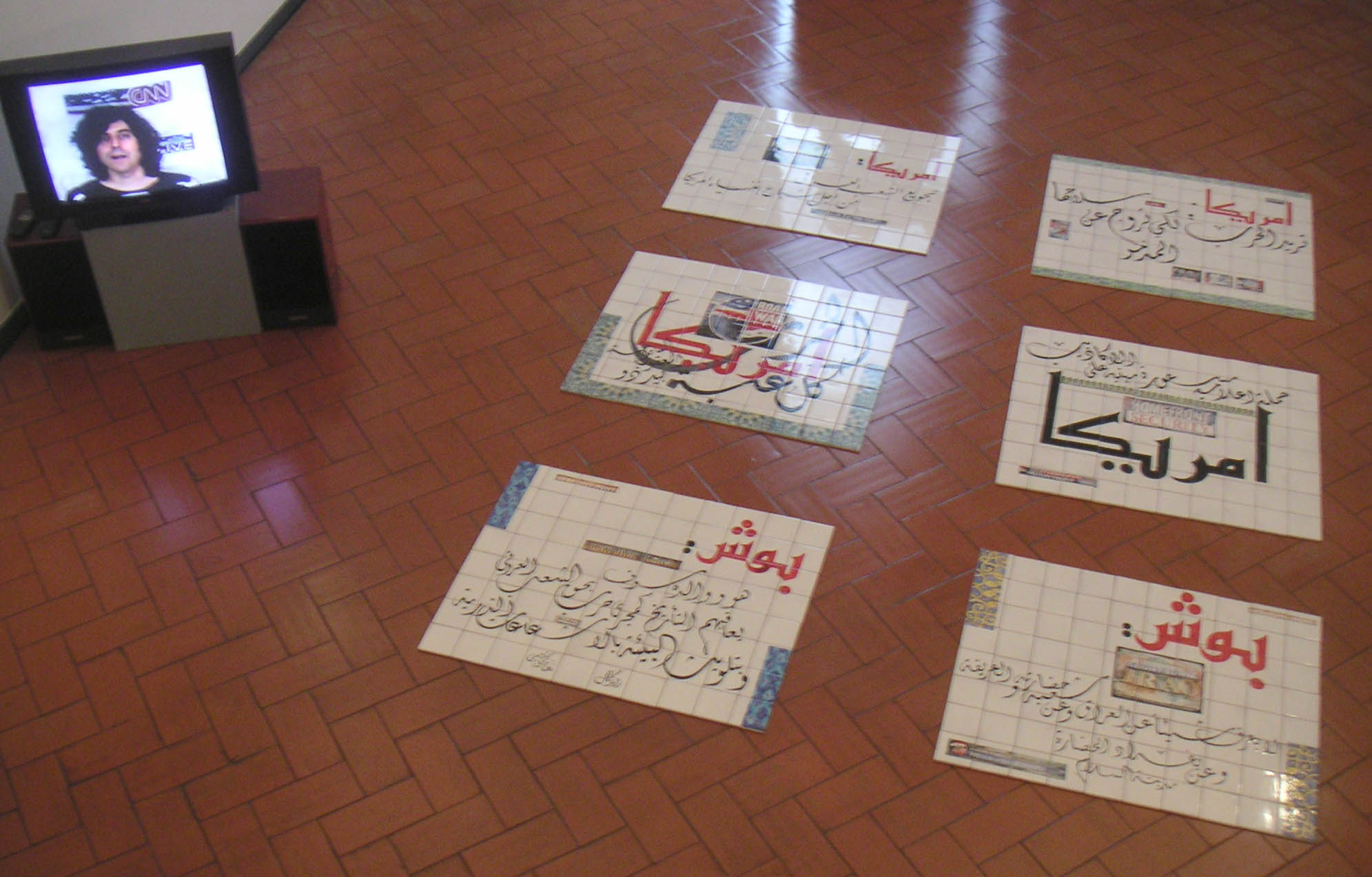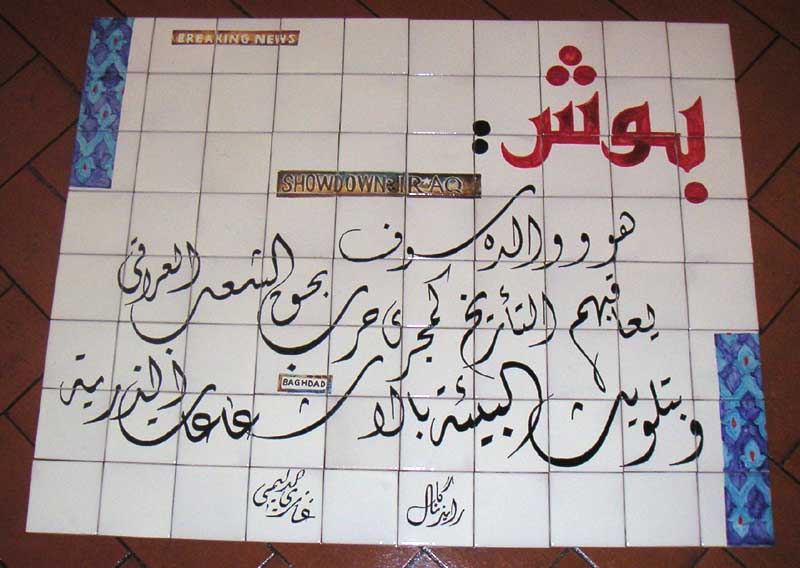 (click image to get high resolution picutre) Rainer Ganahl ARAB DIALOG WITH GHAZI AL DELAIMI, BREAKING NEWS, SHOWDOWN IRAQ, BAGHDAD, 2002/03 Calligraphy and Arabic text: Ghazi al Delaimi; graphics: Alida Sini and Gianna Vacca at ceramic studio: Ernan, Albisola. Translation by Ghazi al Delaimi: Bush and his father will enter history as war criminals against the Iraqi people and as scrupelless destroyer of the environment deploying radioactive weapons. Size: 80 cm x100 cm x 1 cm materials: ceramic tiles: 80 individual pieces, certificate of authenticity photo: Rainer Ganahl