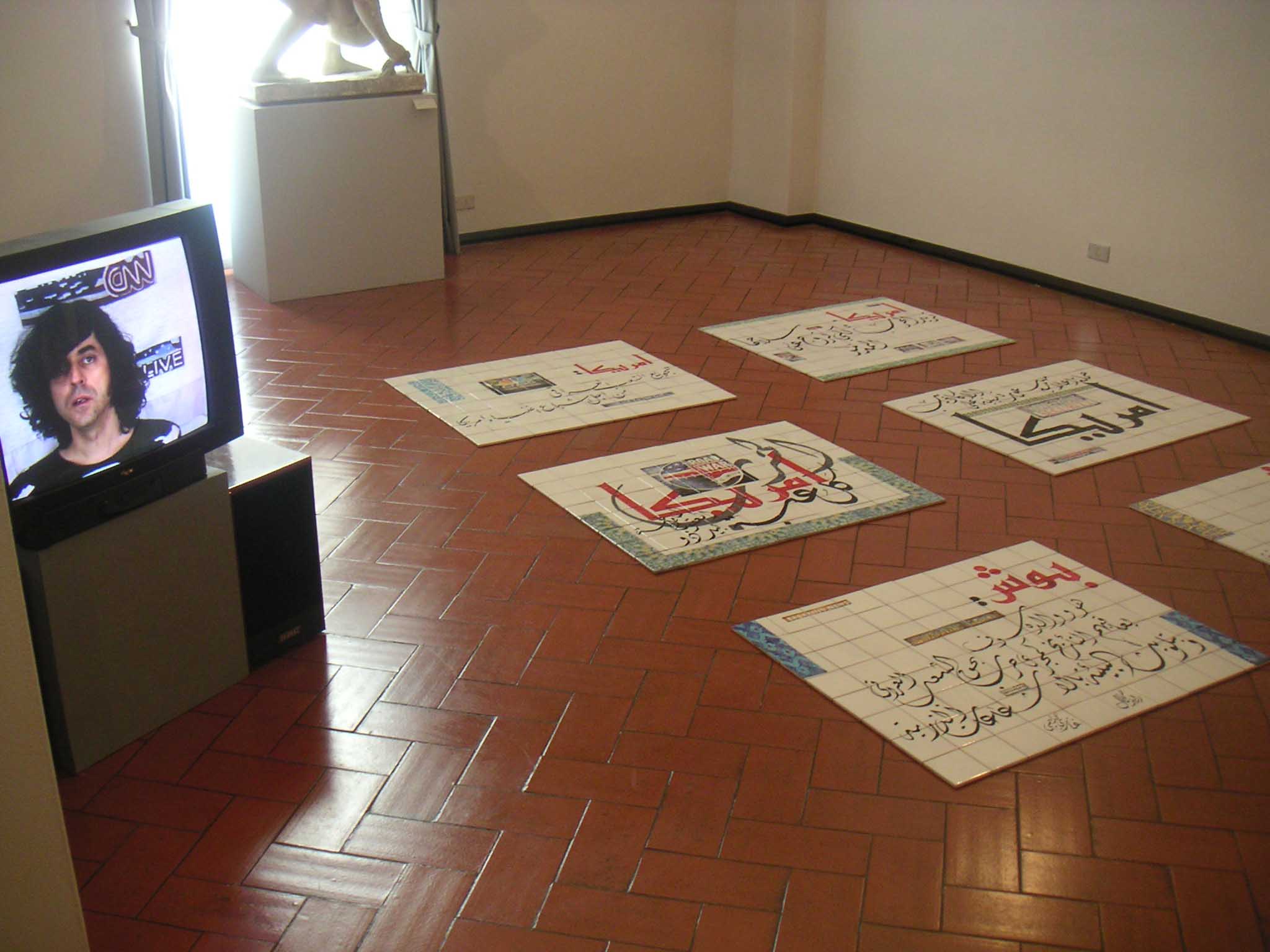 (click image to receive high resolution image) Rainer Ganahl ARAB DIALOG WITH GHAZI AL DELAIMI, ATTACK ON IRAQ?, C-SPAN, CNN, FOX NEWS..., 2002/03 Calligraphy and Arabic text: Ghazi al Delaimi; graphics: Alida Sini and Gianna Vacca at ceramic studio: Ernan, Albisola. Translation by Ghazi al Delaimi: America wants this war in order to demonstrate its latest weapons of destruction. Size: 80 cm x100 cm x 1 cm materials: ceramic tiles: 80 individual pieces, certificate of authenticity photo: Rainer Ganahl