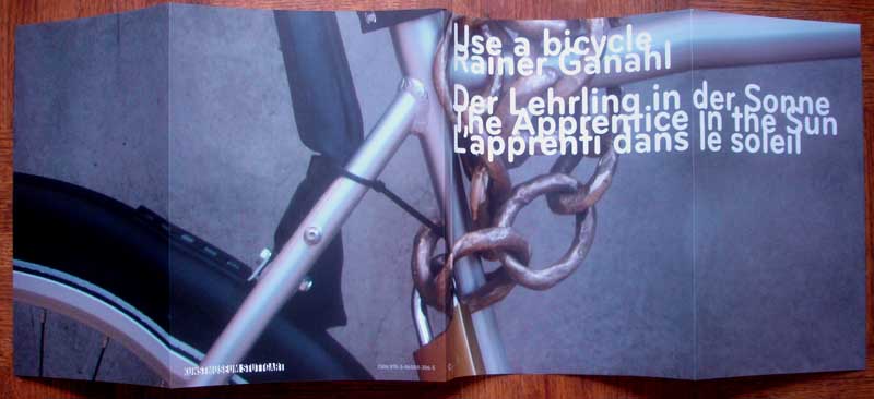 Rainer Ganahl: Use a bicycle, Rainer Ganahl, Der Lehrling in der Sonne. The Apprentice in the Sun, L'apprenti dans le soleil, 2007 Revolver Verlag, Frankfurt, Kunstmuseum Stuttgart. ISBN 978-3-86588-386-5 texts by: Rainer Ganahl, Use a bicycle. The apprentice in the Sun Simone Schimpf, Bicycling Marcel Duchamp. Rainer Ganahl's Bicycle Art order from Revolver, Frankfurt: www.revolververlag.de