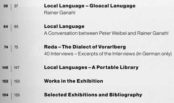 1998 Kunsthaus Bregenz, KUB, Bregenz. order from: infol@kunsthaus-bregenz.at Rainer Ganahl, Ganahl-Dütsch, Gloacal Lanugage, LOCAL Language ..., Kunsthaus Bregenz, Bregenz 1998 with texts by Rainer Ganahl and a conversation between Rainer Ganahl and Peter Weibel - see table of content above ISBN 3-85298-053-4 see exhibition
