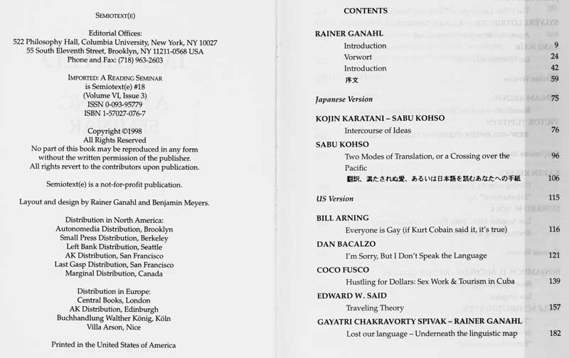 1998 Semiotext(e), order from, semiotext(e) - find on line via google.com. Rainer Ganahl (ed), IMPORTED - A Reading Seminar, Semiotext(e), New York 1998 with texts by: see table of content above ISBN: 1-57027-076-7