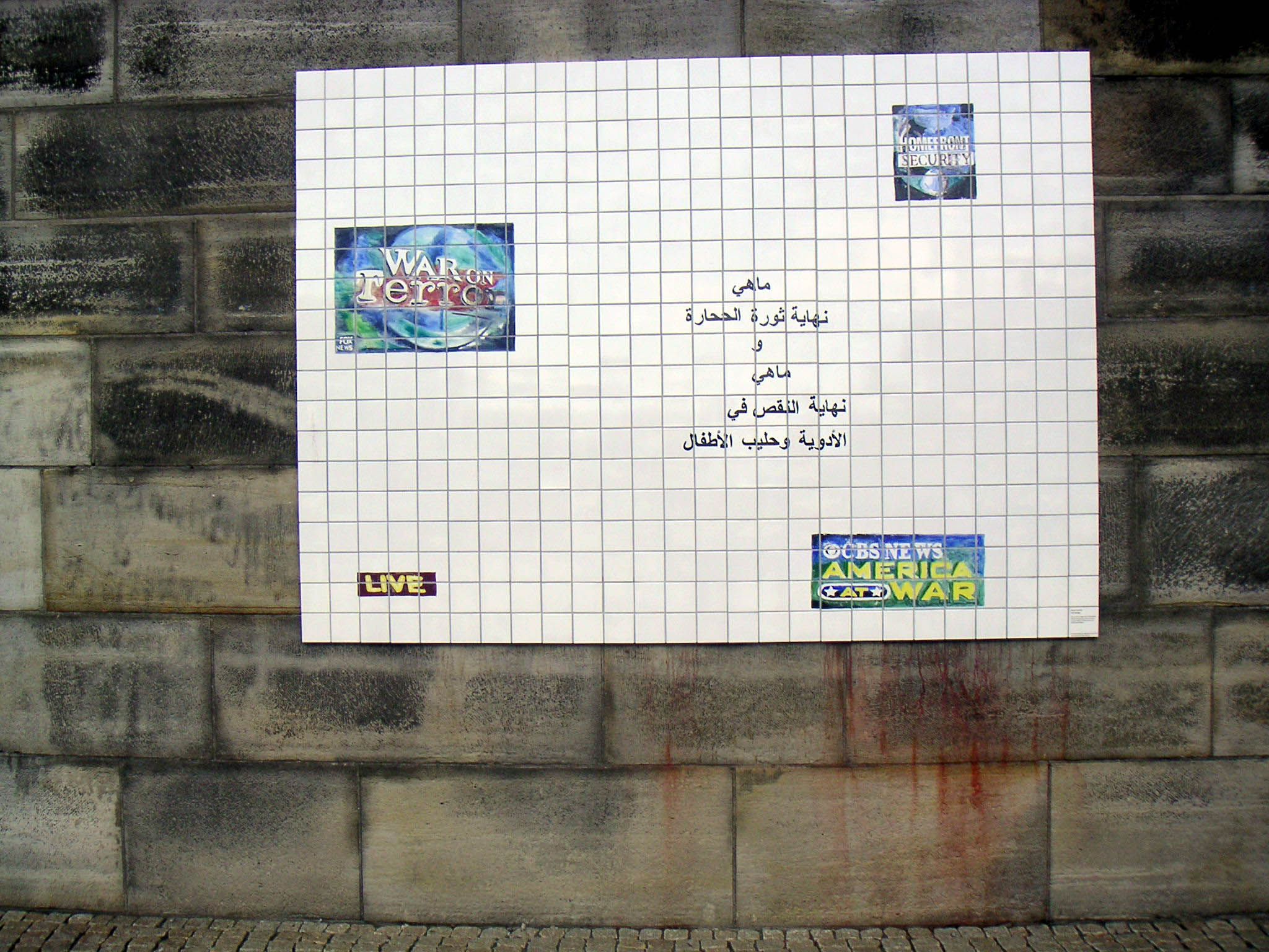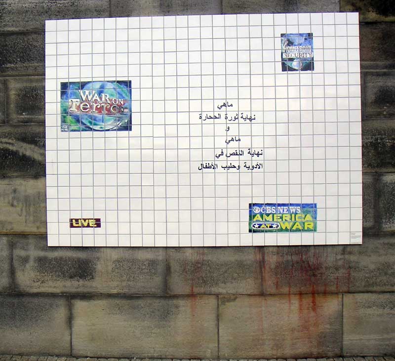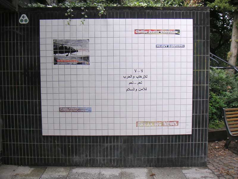 In Bremen, I am invited to an exhibition entitled: "nobody is an island." For this group exhibition in public spaces I would like to apply the Iraq Dialog works directly on the walls. We were able and gain the confidence of Binan Finjan and Ahmet Baban, both Iraqis who emigrated to Germany, living in Bremen. They both collaborated with me for this work and replied to the logos and titles of TV news regarding the Iraq crisis. The work started early 2003 before the war occured and was carried on after fighting activities were officially declared closed. More information onf Mister Finjan and Mister Baban will soon added. Working in public space is less easy than anticipated. Private property owners have all rejected our initiatives. Even installling these works in public space wasn't easy. By the time of the openingwe were able to only put up 4 pieces.