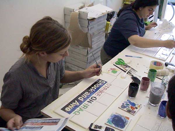 In Bremen, I am invited to an exhibition entitled: "nobody is an island." For this group exhibition in public spaces I would like to apply the Iraq Dialog works directly on the walls. We were able and gain the confidence of Binan Finjan and Ahmet Baban, both Iraqis who emigrated to Germany, living in Bremen. They both collaborated with me for this work and replied to the logos and titles of TV news regarding the Iraq crisis. The work started early 2003 before the war occured and was carried on after fighting activities were officially declared closed. More information onf Mister Finjan and Mister Baban will soon added. Working in public space is less easy than anticipated. Private property owners have all rejected our initiatives. Even installling these works in public space wasn't easy. By the time of the openingwe were able to only put up 4 pieces. production photos:
