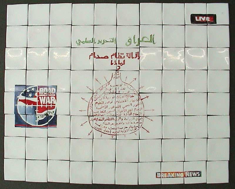 IRAQ DIALOG: BIG STORY SHOCK & AWE, BREAKING NEWS, AMERICA AT WAR2003 Arabic text and calligraphy by Hikmat, 2003 logo painted by RG Translation: (21 B) IRAQ / FREE INDEPENDENT SOVEREIGN STATE / NATIONAL IRAQI SOVEREIGNTY IS THE AIM OF THE IRAQI PEOPLE / UN SECURITY COUNCIL RESOLUTION 1483 / AUTHORIZES US + UK TO LAUNCH WAR AND OCCUPATION OF IRAQ / SHAME ON THE UNITED NATIONS/ US + UK / HIJACKED THE SOVEREIGNTY OF IRAQ FROM THE IRQI PEOPLE APPROVED BY THE WORLD COMMUNITY painted and fired ceramic tiles, size : 60 cm x 80 cm