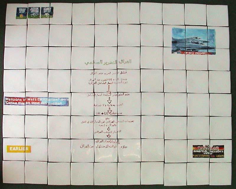 IRAQ DIALOG: TARGET IRAQ, CNBC, BAGHDAD, WAR ON TERROR, 2003 Arabic text and calligraphy by Hikamt, 2003 LOGO PAINTING: casco team translation: IRAQ PEACEFUL LIBERATION size : 80 cm x 100 cm,