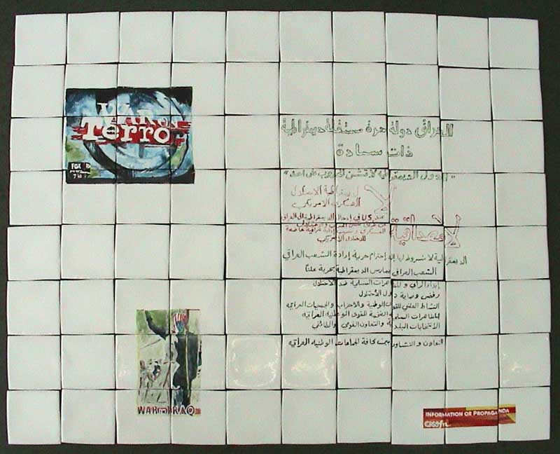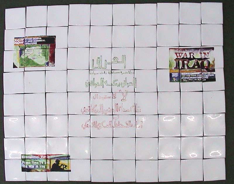 IRAQ DIALOG: INFORMATION OR PROGPAGANDA, WAR IRAQ, BAGHDAD WEATHER, 2003 Arabic text and calligraphy by Hikmat, 2003 logo painted by CASCO teacm Translation: IRAQ / FREE INDEPENDENT STATE / NO LEGALITY FOR THE WAR AGAINST IRAQ / THE NATURAL RIGHT OF THE IRAQI PEOPLE TO REJECT, RESIST ADN REMOVE OCCUPATION. painted and fired ceramic tiles, size : 80 cm x 100 cm