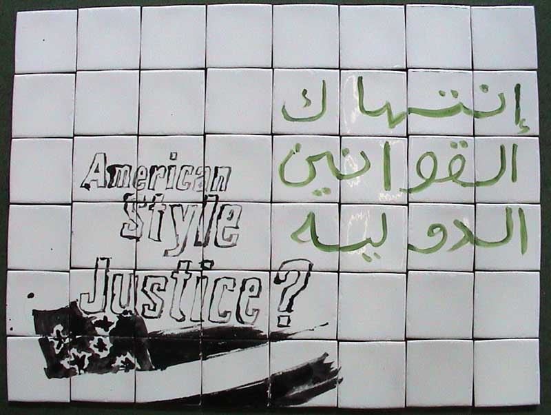 Iraq-dialog: AMERICAN STYLE JUSTICE, 2003 Arabic text and calligraphy by Hikmat, 2003 logo painted by: RG translation: Violation of international laws painted and fired ceramic tiles, size : 60 cm x 80 cm