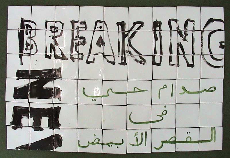 IRAQ DIALOG: BREAKING NEWS, 2003 Arabic text and calligraphy by Hikmat, 2003 logo painted by RG Translation:SADDAM IS ALIVE IN THE WHITE HOUSE! painted and fired ceramic tiles, size : 60 cm x 80 cm