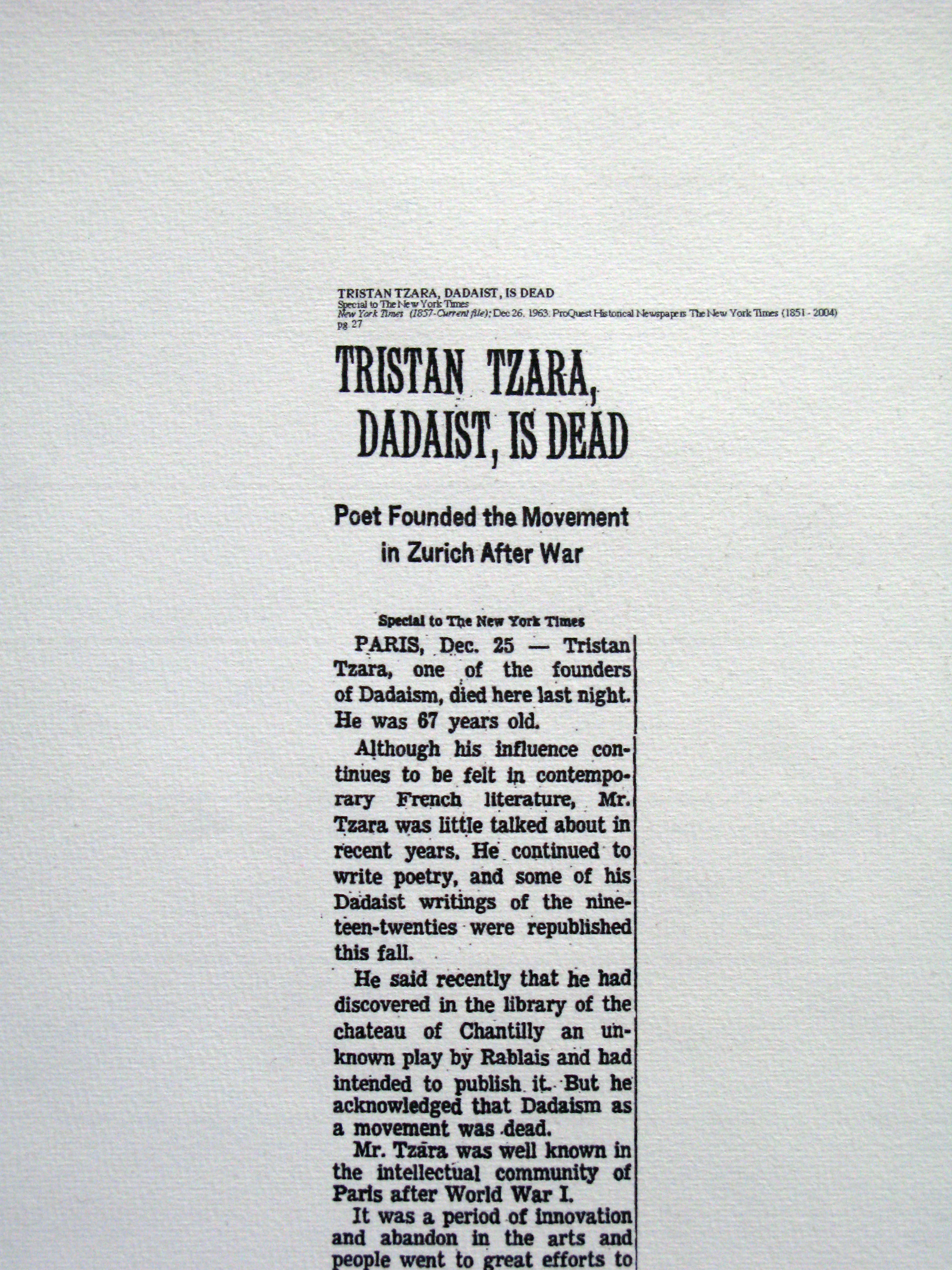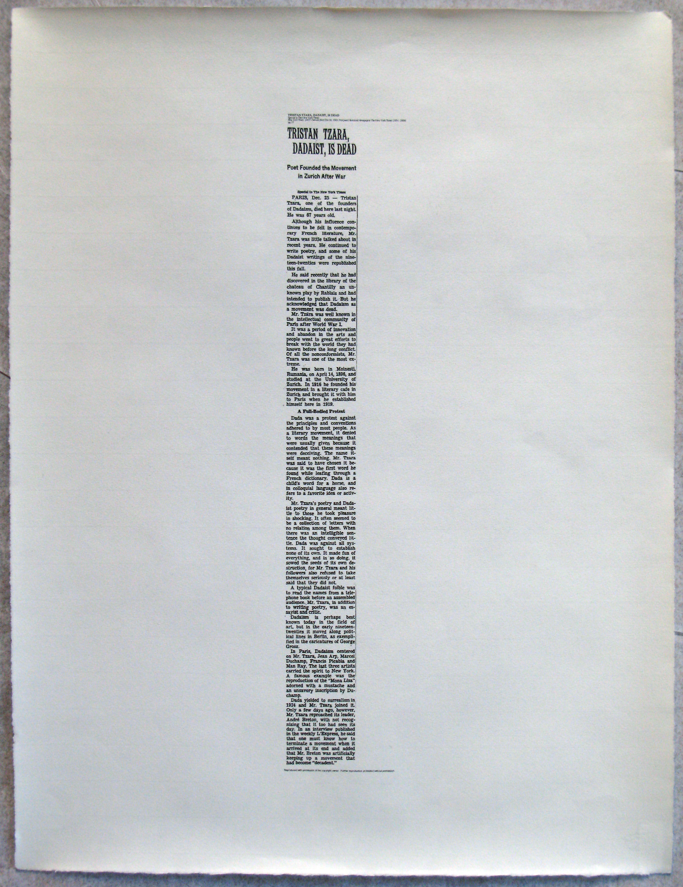 DADALENIN NY TIMES DADADEATH, Tristan Tzara, 1963, 2008 ink jet print on paper, 64 x 48.5 cm / 25 1/4" x 19 1/8 inches
