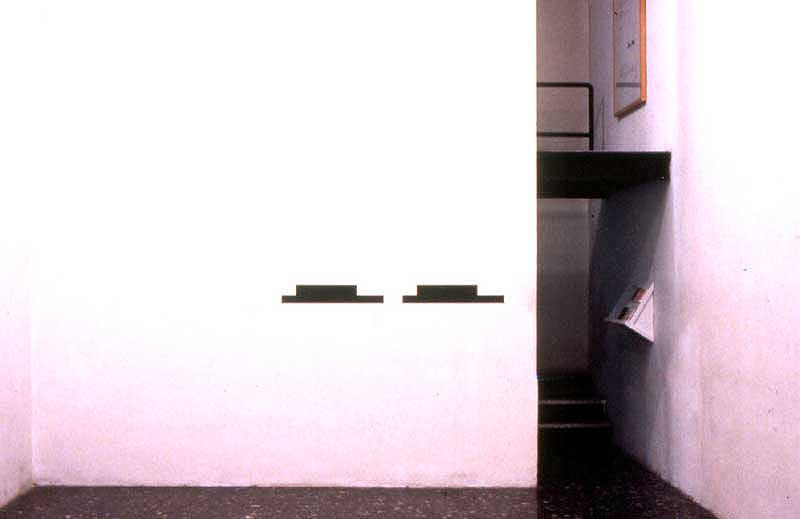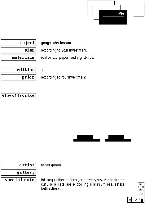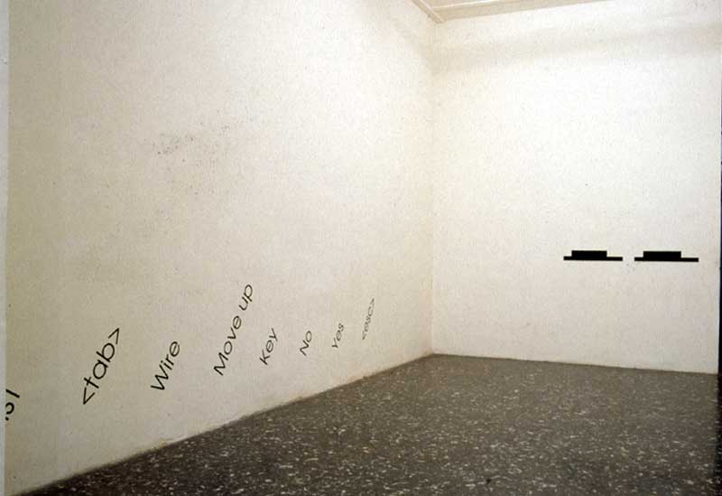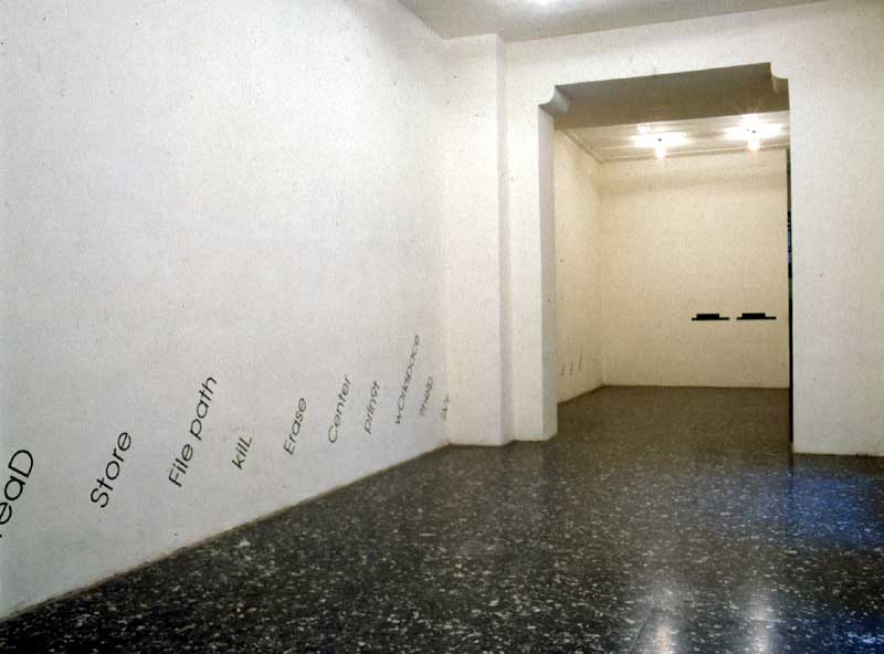 Milano list, wall painting (this part of a work entitled citY list) - see file below it addresses questions of computer language and site specificity. the computer language belonged to a Unix code and is now not in use anymore. the aggressivity of the language at the time was impressive. all three wallpaintings are part of my 'file system' - see below - and address issues of urban space and how it is defined by discourses of power, technology and capitalism. elements from the two extra files were drawn directly onto the opposing wall joined by the running work city list (milan list). this works always starts with the place it is executed. I was able to do these city lists in Austria (1989), Holland (1989), düsseldorf (1989), dallas (1992), new york (1992) and tokyo (1993). the files had been presented as framed large scale photographs.