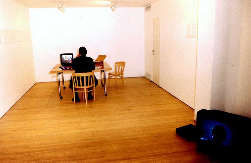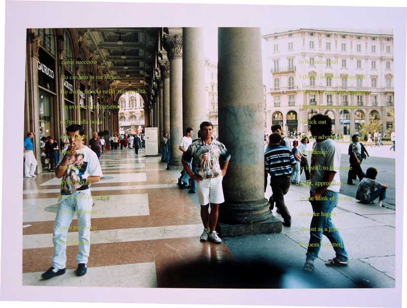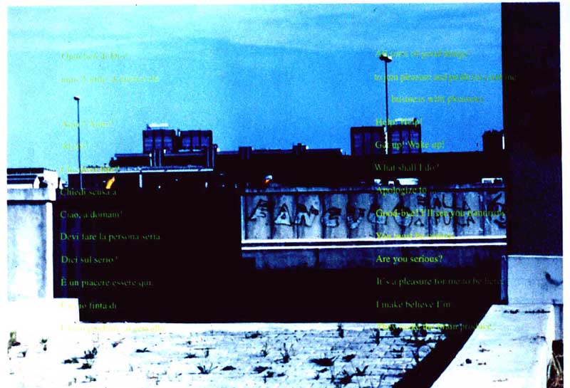 Please, teach me Italian For about a week I was reading texts by Pier Paolo Pasolini in Italian with friends from the gallery. the results served to make an exhibition and justify a series of about 10 photographs entitled: 'basic italian'... (see a view pictures below). the study sheets are works on paper "basic italian, (study sheets). basic italian - the photographs are photos I have taken in summer of 1996. I simply added text elements taken from basic italian study books. studying foreign languages is part of my art work. see "a tast for studies" a second edition of this work in Italy was recently done by me in Florence, at Base with the texts of Antonio Gramsci a video entitled Please, teach me Italian was part of the show.
