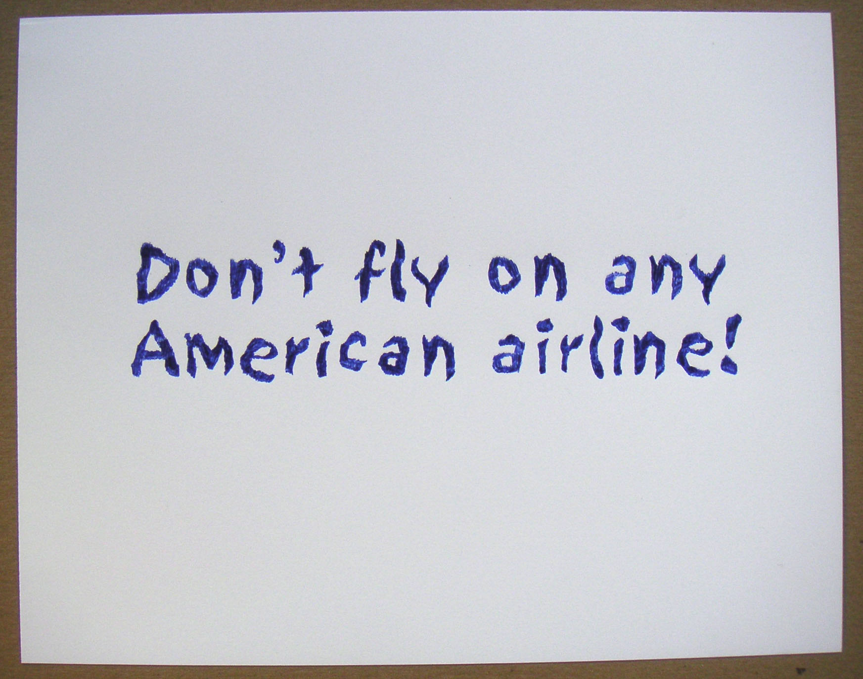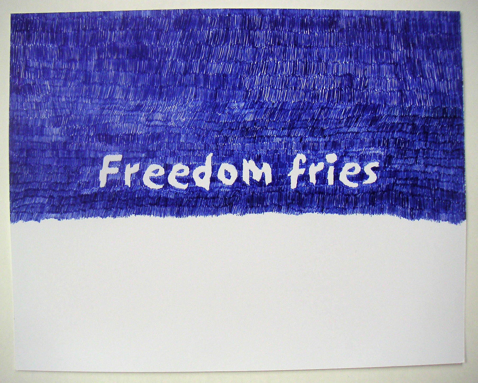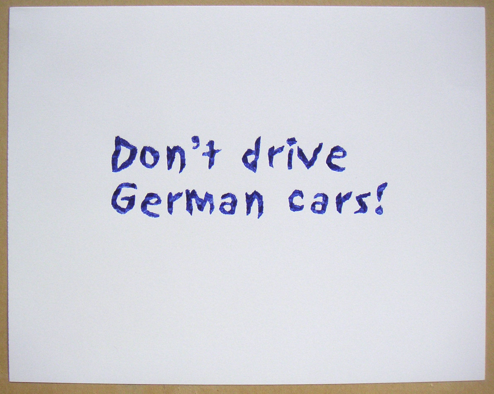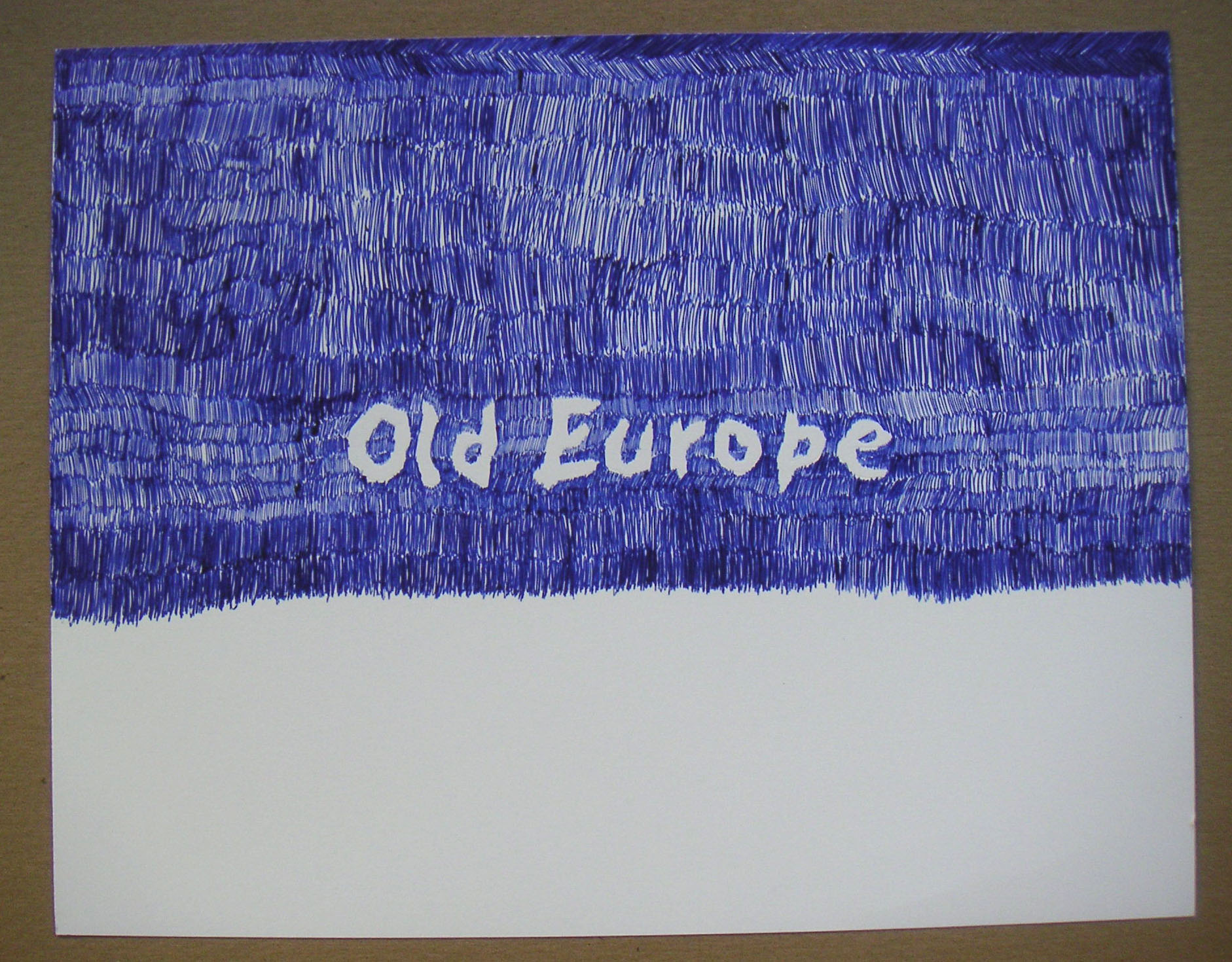 this is a series that I first initiated in 2000, after the reaction of the Belgian foreign minister to the election of the right wing politiician Haider into the Austrian government: He pronounced publicly: Don't ski in Austria. (I agree with opposing Haider, but I thought that this kind of opposition was highly problematic) George W. Bush's administration did a similar propaganda against France (and others) opposing the Iraq war: the White House restaurant discontinued serving French wine and so-called French Fries where renamed: Freedom fries. The first series of graphite pencil drawings ( 70 x 100 cm ) included the sentences: Say NO to all kind of right wing politics. For a second series of "Don't .... series," this sentence is not anymore necessary. There are different sentences added and the size is smaller: 9 x 12 inch; 22.9 x 30.5 cm. I draw them by myself with ball pens. I intend to make them in several colors: So far, a blue one is shown in Belgium and a black version is shown in Bremen. Other color sentences are not drawn yet (they mightnever be done.. as so many planed things in my life) THE TITLE of all these drawings is identical with th text of the drawings (color and size need to be specified) For high resolution image, please, click the image for download: