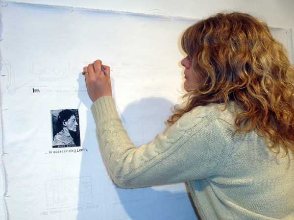 HOMELAND SECURITY I-V, 2003 work behind is: embroidery made by Pashtuns near the Afghan border in Pakistan according my design taken from network news during the time of the bombing of Afghanistan.. see more works: