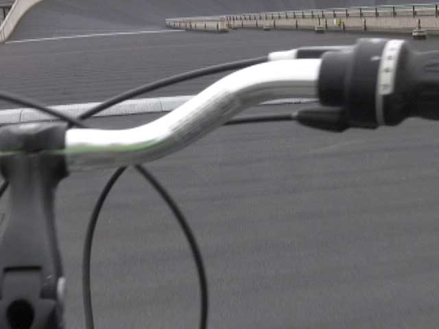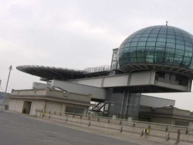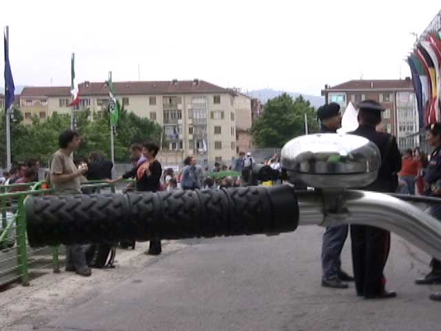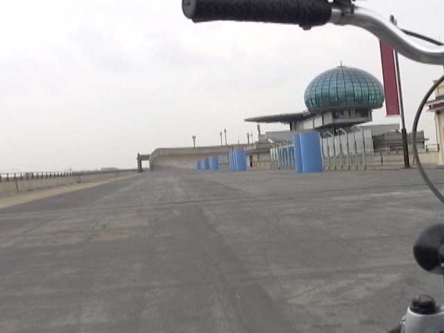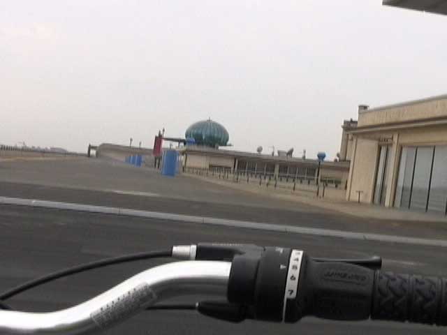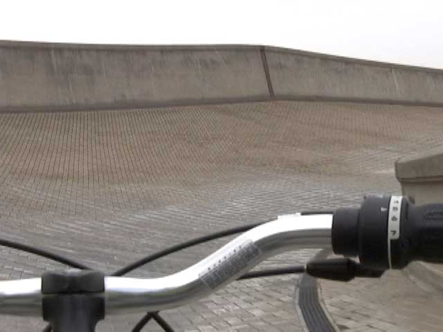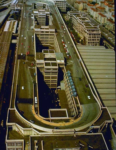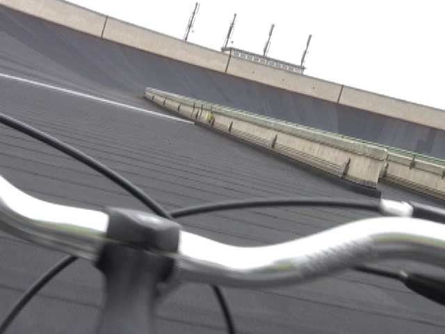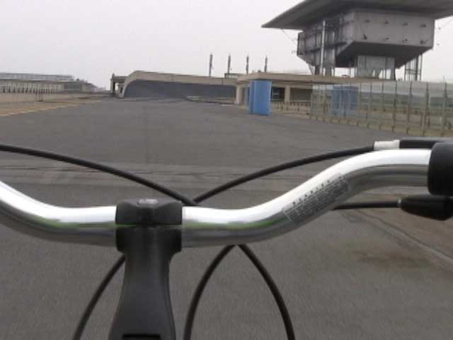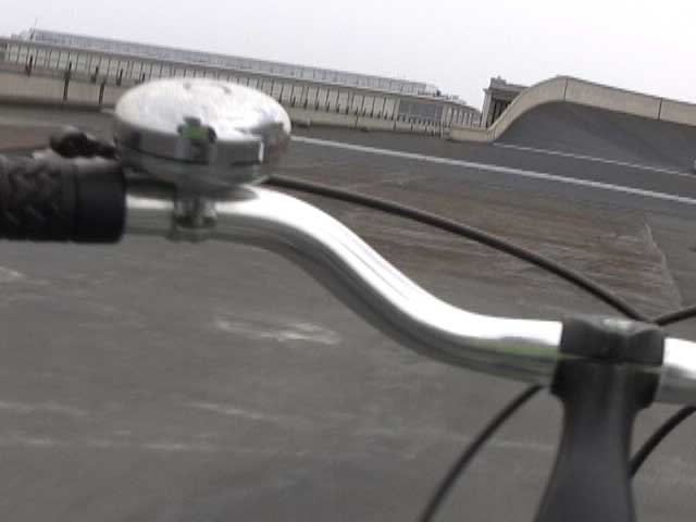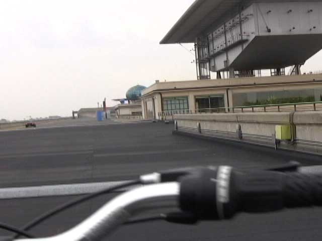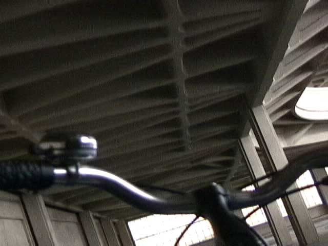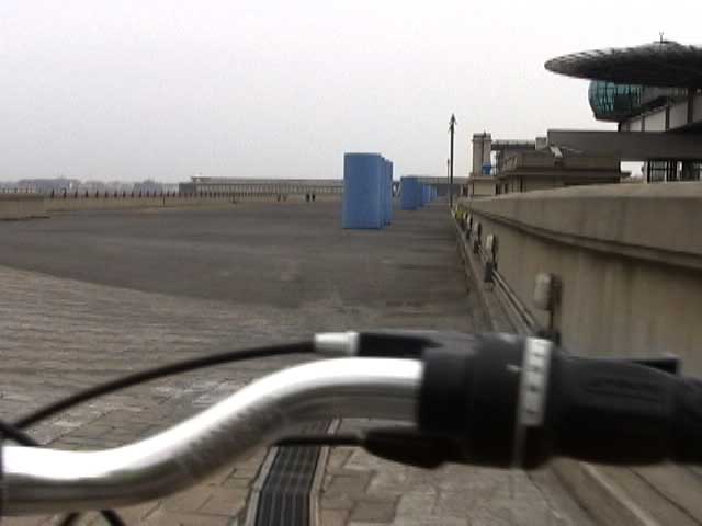 Bicycling FIAT - The Lingotto Fiat Factory 1921 - 2007, Turin 10 min TheLingotto Fiat Factory, build in the 1920s is not only a masterpiece of industrial architecture but also an utopian embracement of car manufactoring in Europe. The factory has a racing course on the roof that was used until the 1980s for testing cars before the factory was decommissioned. Today the factory is a shopping and entertainment center with a hotel and many other facilities, hence in line with the fate of manifacturing in a globalised world. (work is outsourced and workers made into consumers ) "La pista" as it is called in Italian has no particular use and is closed to the public because the racing track is in bad condition. I was able to get access and bicycle several turns to finally decend on the caroussel end of the factory.