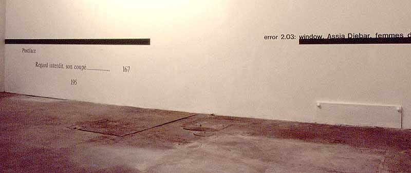 | installatin views (above): error: 2.03: window, Asia Djebar, femme d'Alger wall painting, certificate of authen1icity, 1993 dimension variable, in Grenoble, appr. 6 meters long
