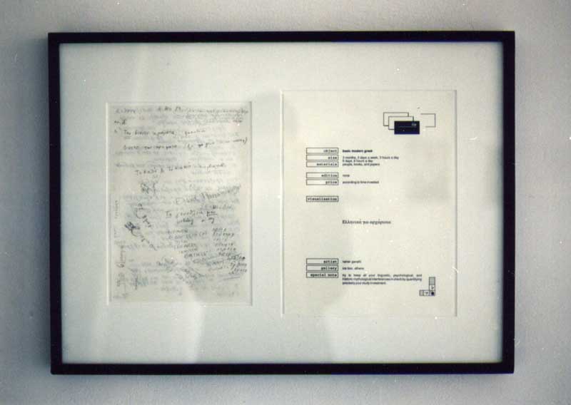 ICE BOX, Athens, 1995 For this exhibition I have studied Modern Greek and produced an exhibition around this idea. Studying languages is part of my art practice since 1992. Modern Greek was the third language for this art approach after Japanese and Russian. Greek studies were the "German Orient". Greek "Guest workers" in Germany in the post war period discriminated partially because they spoke greek, whereas in high school and at university, classical greek still was considered the non plus ultra of knowledge, a kind of elitist exclusive Bildung. The connection between Orientalist studies and imperialist poltics is also obvious in the politics of Greece: in the early 19th century, the brother of Bavarian's romantic king Ludwig became the kinf of Greece, a royal dynasty that still is repsected to these days. Greek studies and german nation building went hand in hand. more about language lerning see texts: (index page)