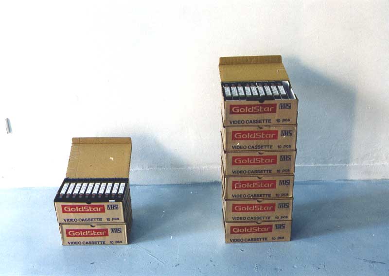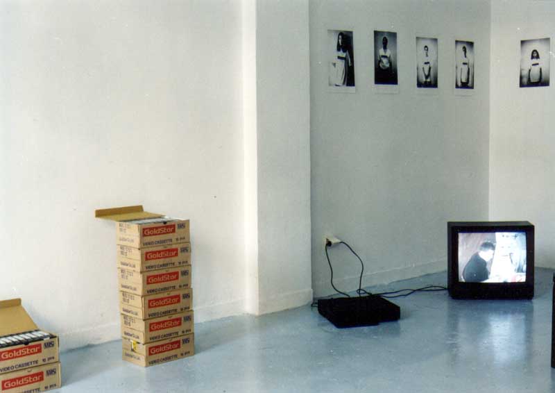 ICE BOX, installation view, 1995 3 months, 3 days a week, 3 hours a day - basic modern greek. (video tapes) 1994/95, 120 hr video tapes 5 days, 5 hours a day - basic modern greek (video tapes) - 1995 - 20 hr video tapes Please, teach me Modern Greek, (10 photographs, black and white)