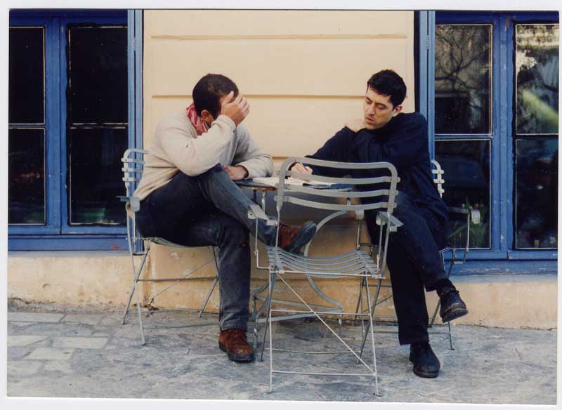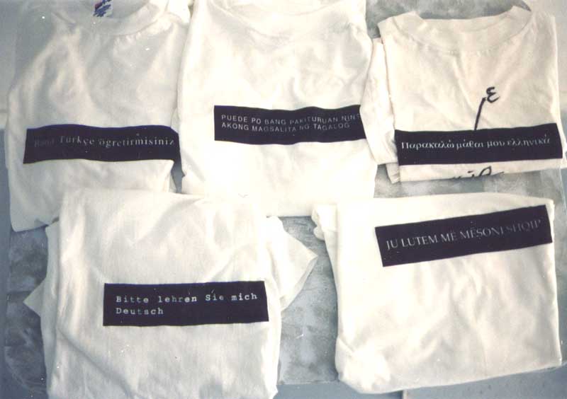 for this exhibition I made the major work entitled: 3 months, 3 days a week, 3 hours a day - basic modern greek. (video tapes) 1994/95, 120 hr video tapes in greece: 5 days, 5 hours a day - basic modern greek (video tapes) - 1995 - 20 hr video tapes (for the first time, I have recorded my own study process, something that has become important since: basci korean, basic chinese, basic arabic ) also, a series of photographs, entitled: please, teach me modern greek - portraits of people wearing all the same t-shirt with the greek text for "please, teach me modern greek")