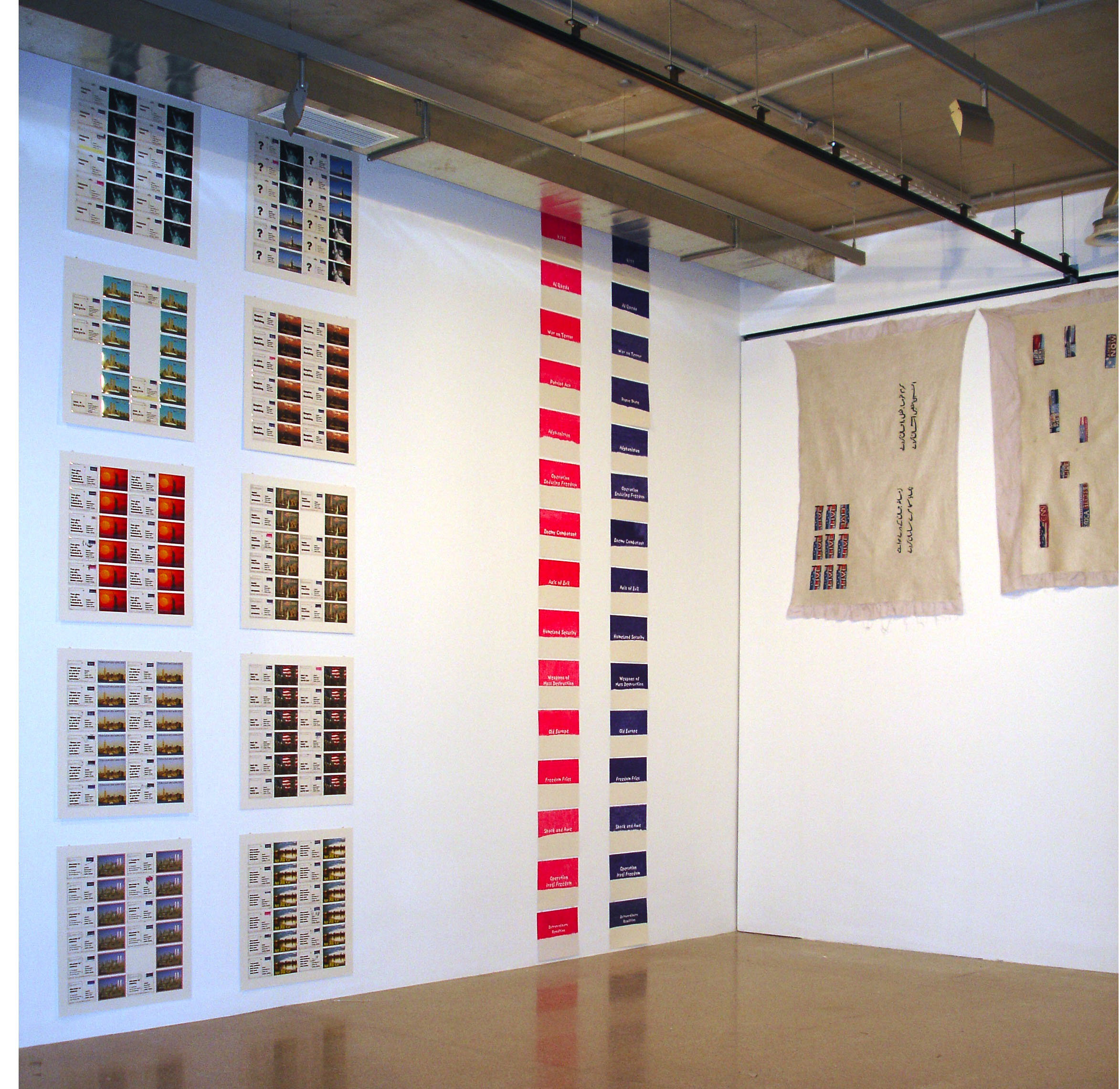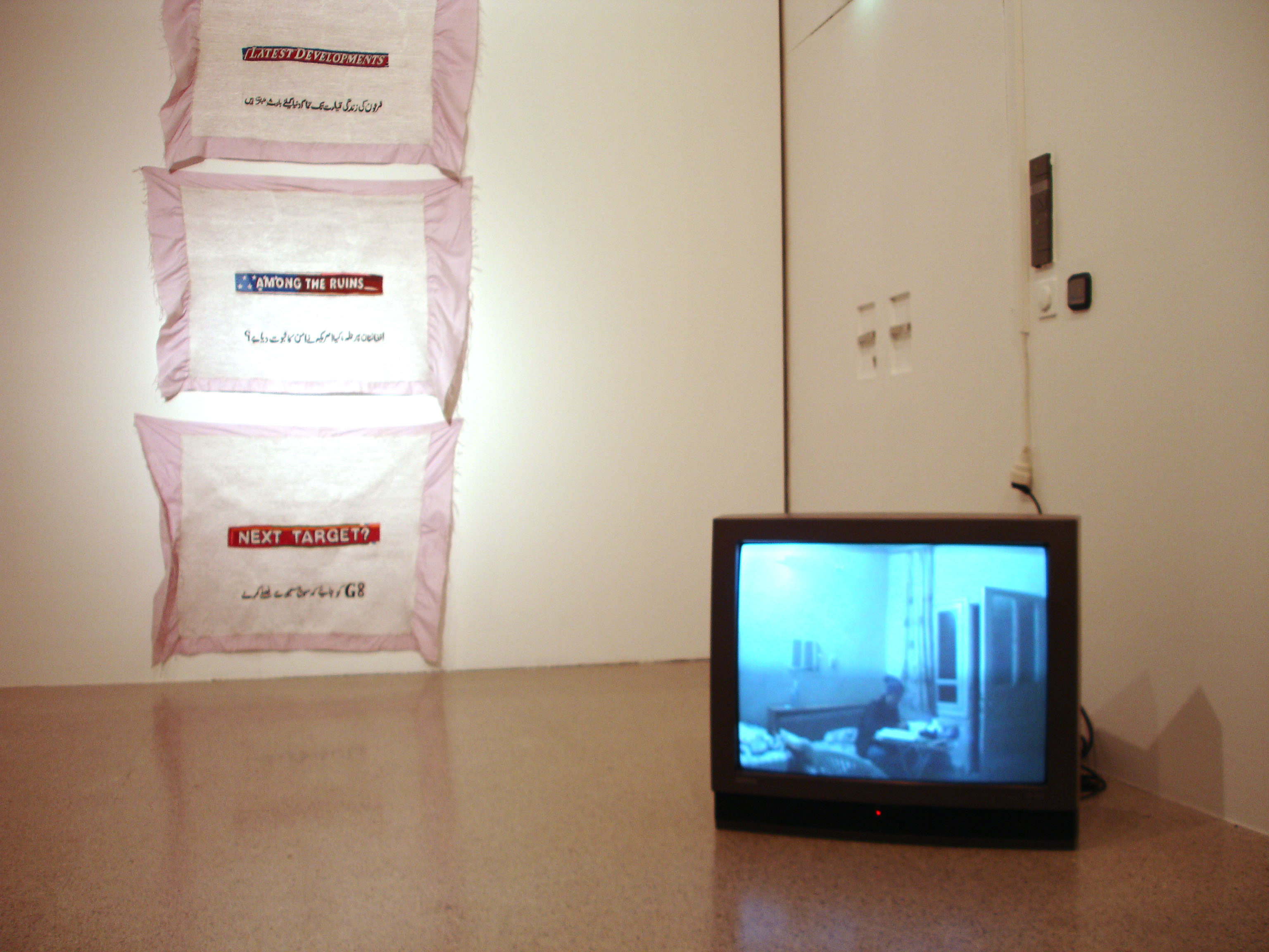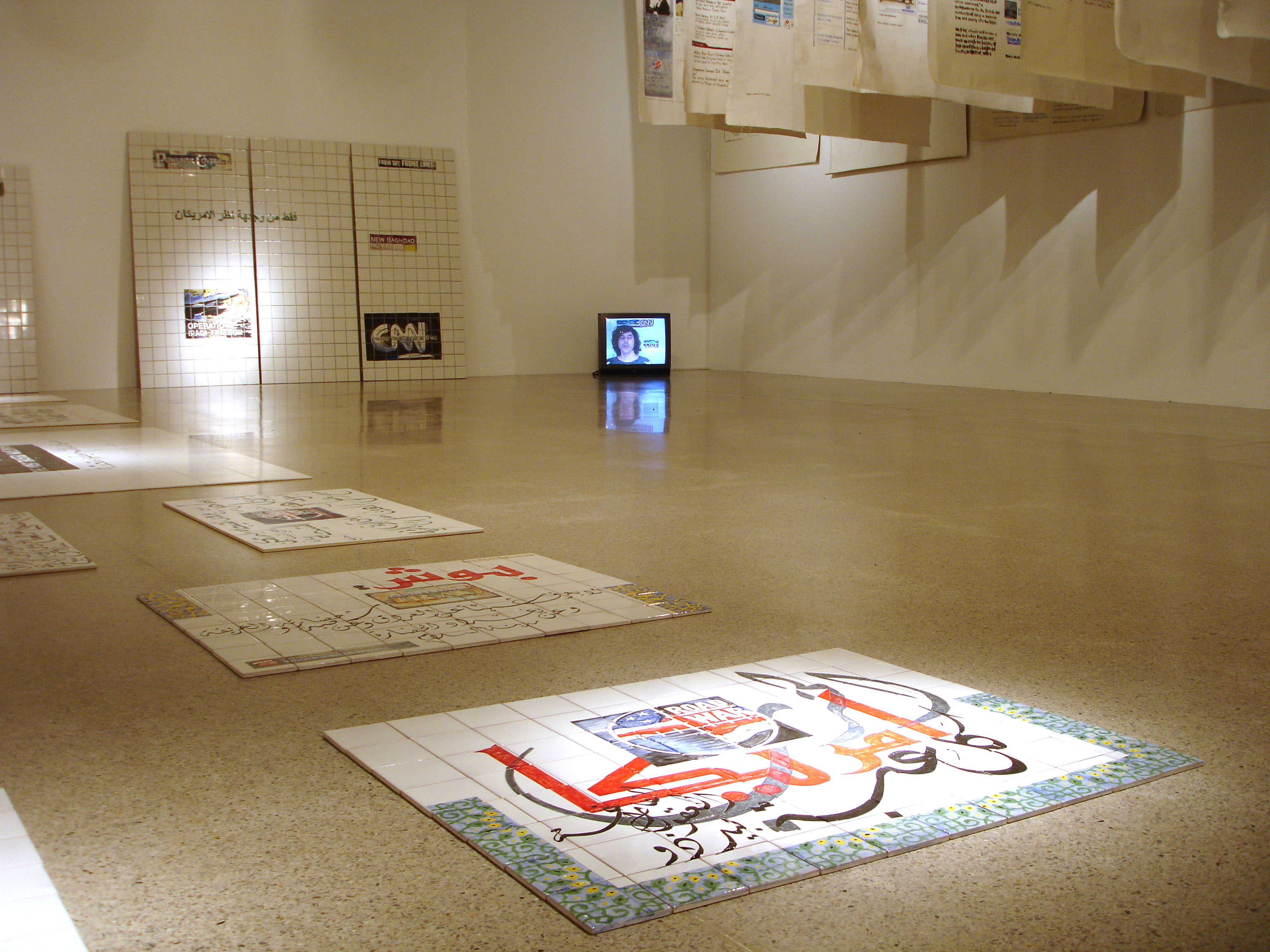 AFGHAN DIALOGS - silk embroideriesIRAQ DIALOGS - fired ceramic tilesARAB DIALOGS - fired ceramic tilesNEWS PAINTINGS - Acrylic on canvasBICYCLING DAMASCUS - videoHOMELAND SECURITY - videoINSTALLATION VIEWS - installation views