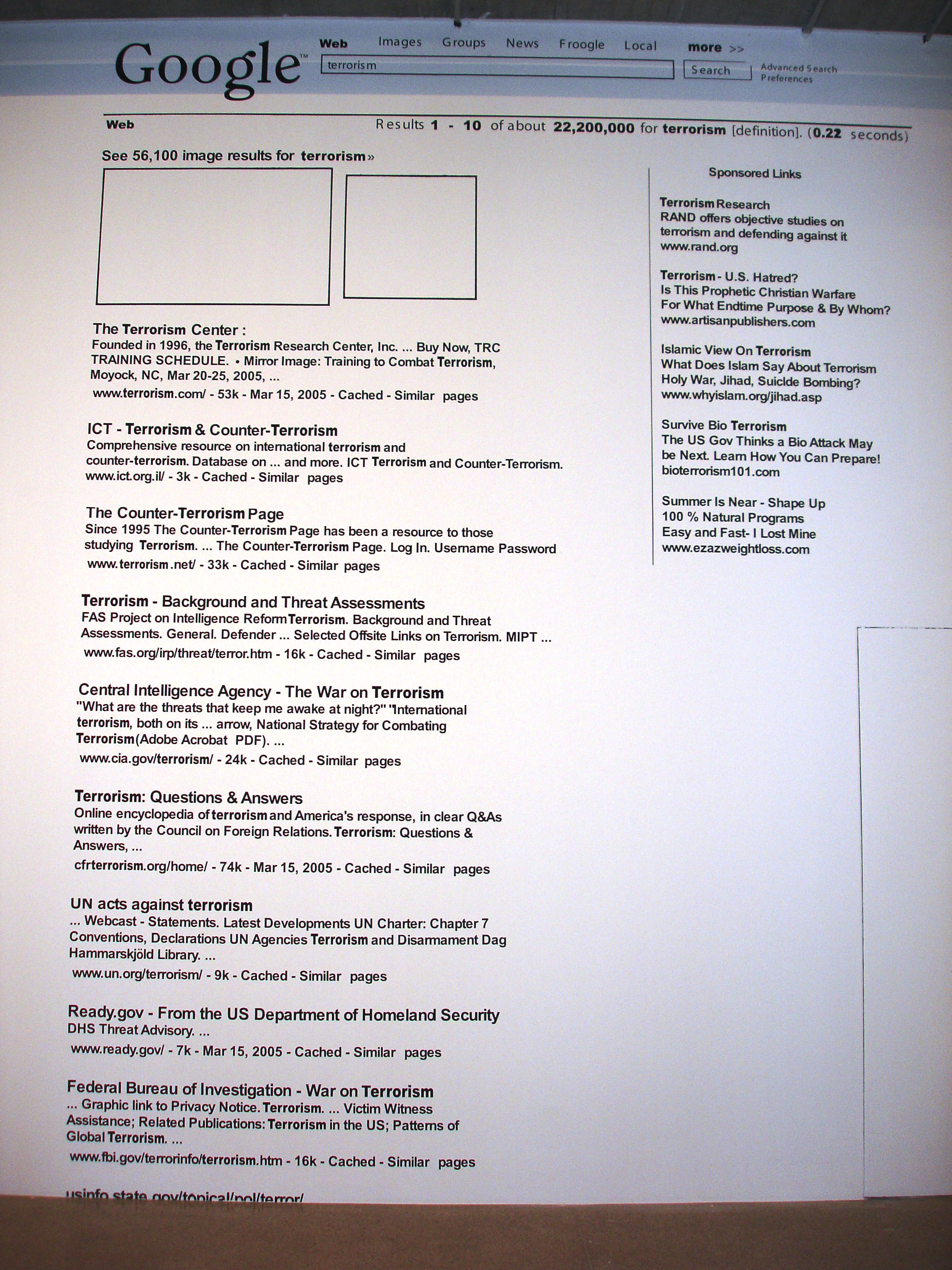 Francesco Manacorda - Filtering NewssPaul Mattick - POSTCARDSRainer Ganahl - ROAD TO WAR Ð The Burning Of History Gone Evil Onto A Pathetic External Hard DriveSearching "Terrorism" on Google.com - wall painting |