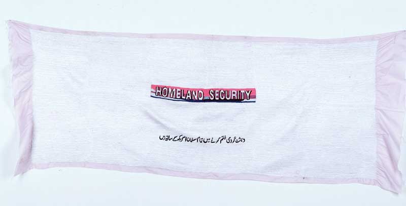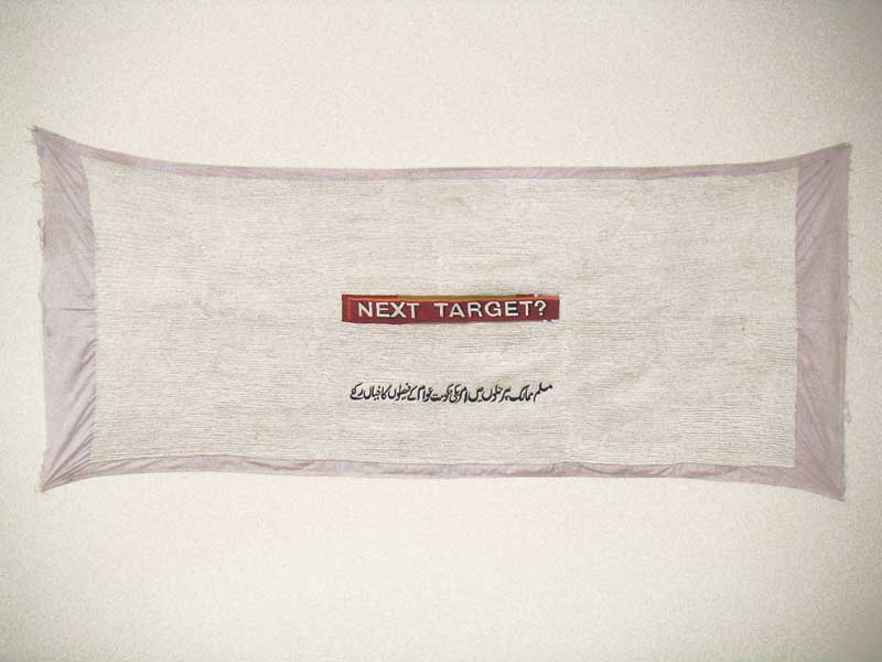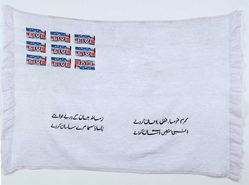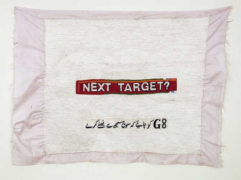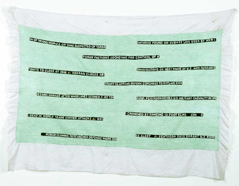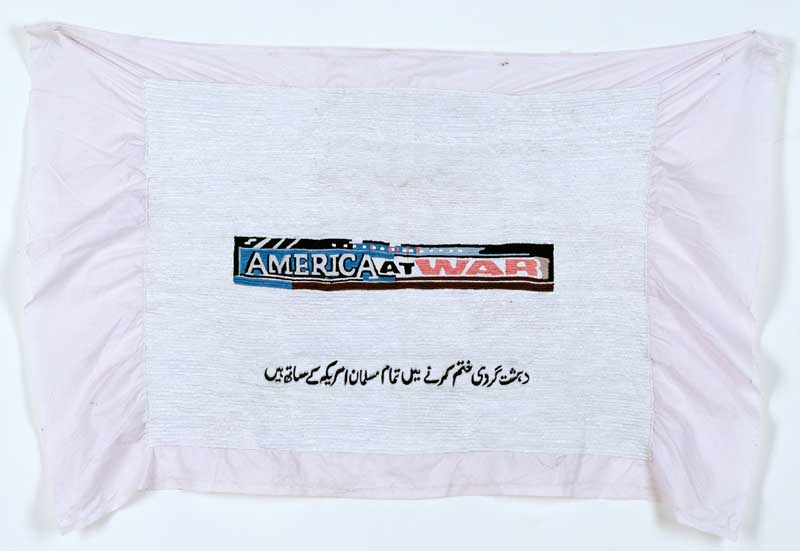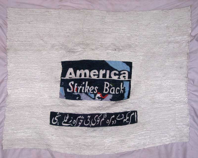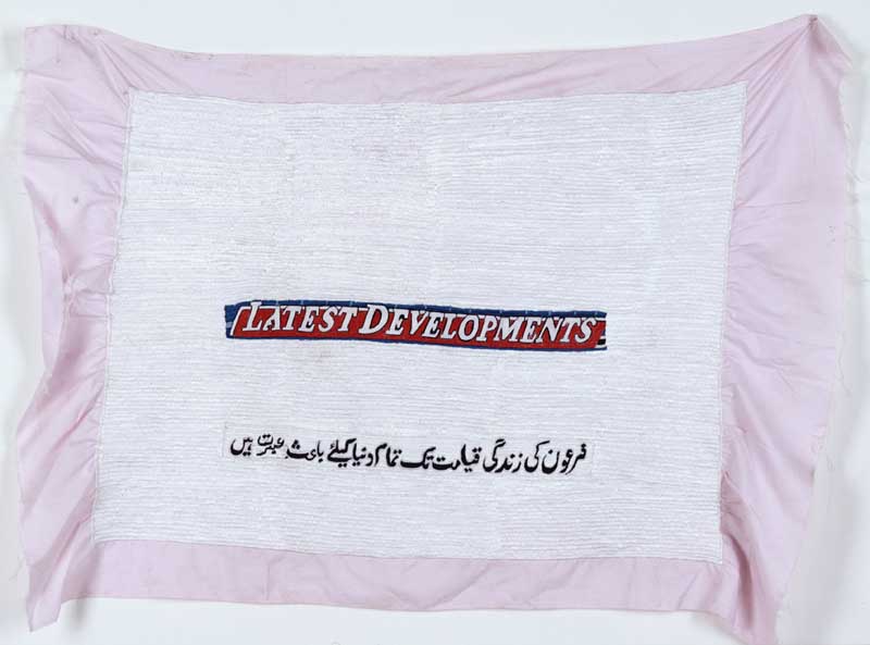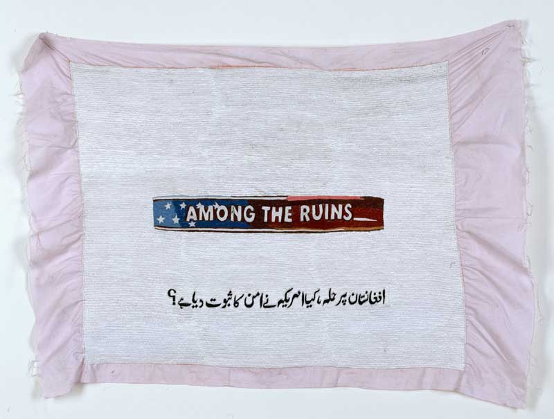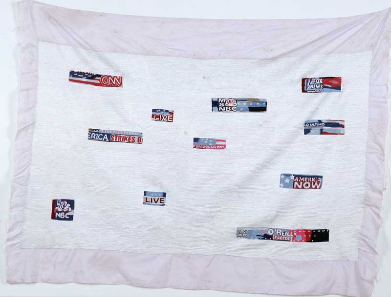of silk embroideries with reactions by Afghanis to network logos, headlines,