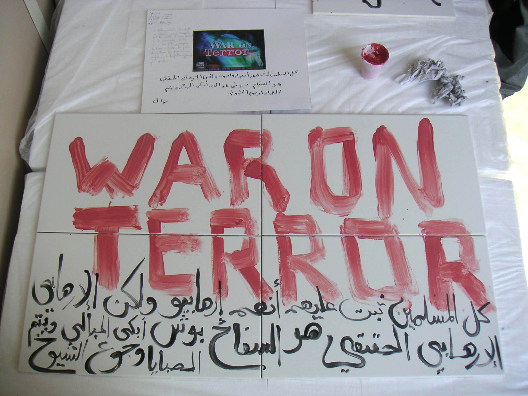 (X) 32.5x53 cm ARAB DIALOG WAR ON TERROR, 2003 Arabic text: Naval (woman); calligraphy: Siyam Mohsen; graphics: Rainer Ganahl Translation by Siyam Mohsen: All muslims are now looked at as terrorists but the biggest and real terrorist is Bush, the molester of children who made mothers suffer and who made of children orphans and who starved the elderly. Size: 65 cm x 106 cm, materials: ceramic tiles: 4 individual pieces of 32.5 x 53 , certificate of authenticity Hakima is a woman from Marrocco and works in a bar.