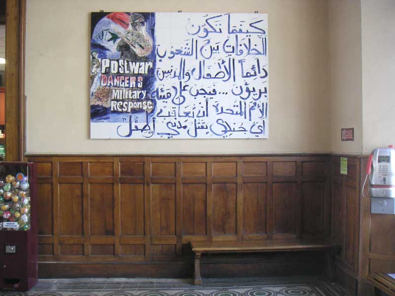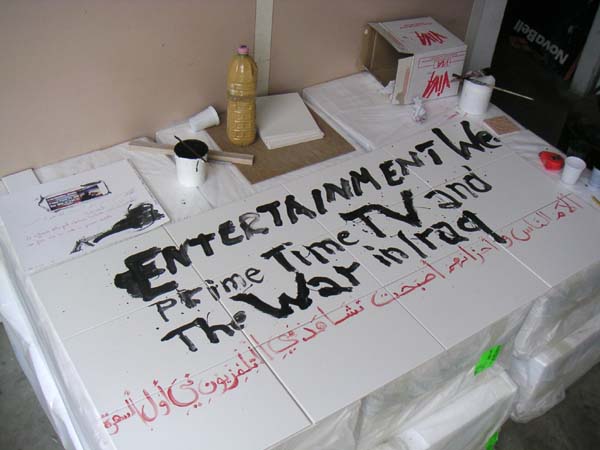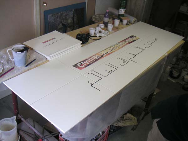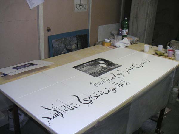 click image to download 3.2 mb image: (L) ARAB DIALOG WITH ALI -- , BAGHDAD FIREFIGHT, COMPLETE COVERAGE, 2003 Arabic text: Ali; calligraphy and graphics: Siyam Mohsen Translation by Siyam Mohsen: The war against Iraq initiates the war against all Arabs. Size: 160 cm x 250 cm x 1 cm, materials: ceramic tiles: 80 individual pieces, certificate of authenticity Ali preferred not to give his full name. He is from Morocco and works in a ceramic factory in Sassuolo.