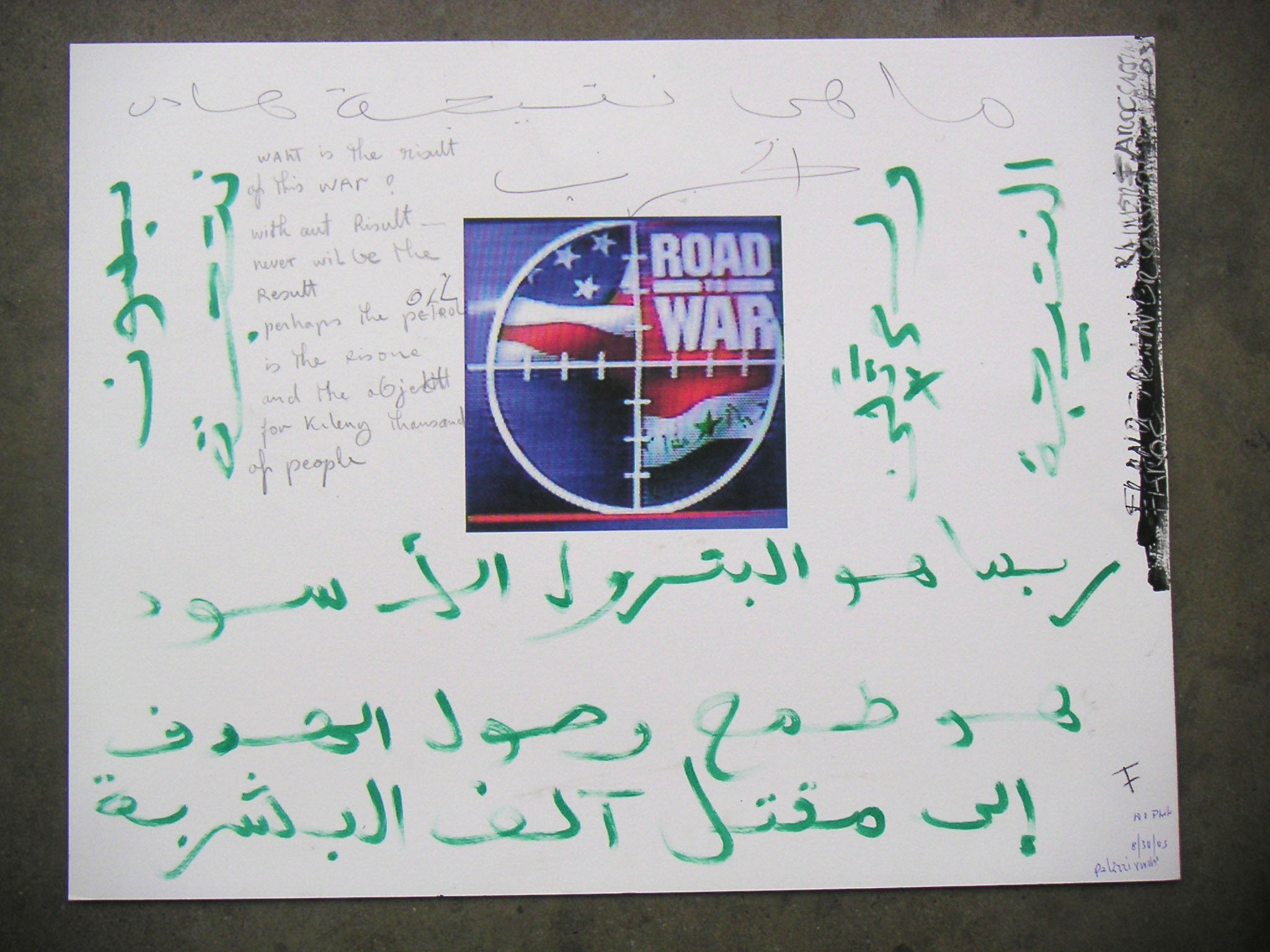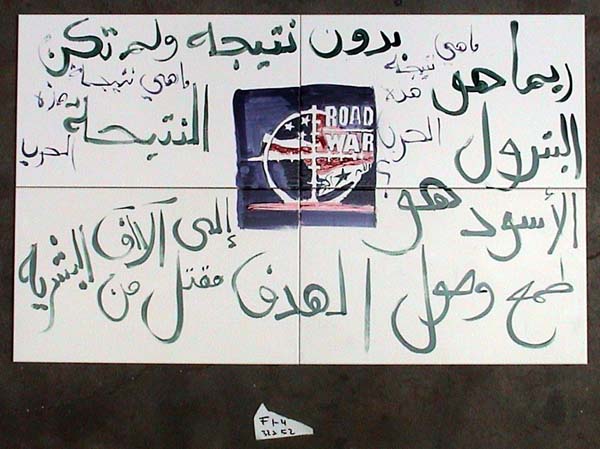 (F) ARAB DIALOG WITH FAROQ, ROAD TO WAR, 2003 Arabic text: Faroq; calligraphy and graphics: Siyam Mohsen Translation by Siyam Mohsen: What is the result of this war? Never will there be a result. Perhaps oil is the reason for killing thousands of people. Size: 65 cm x 106 x 1 cm, materials: ceramic tiles: 4 individual pieces of 32.5 x 52 , certificate of authenticity Faroq didn't want to give his full name. He is a ceramic worker in Sassuolo and comes from Marocco. |