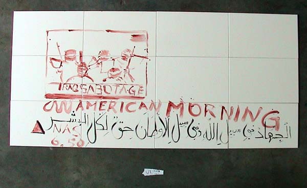 (UI) click here to download ARAB DIALOG WITH SIYAM MOSHEN, CNN, IRAQ SABOTAGE, AMERICAN MORNING, 2003 Arabic text, calligraphy: Siyam Mohsen; graphics: Rainer Ganahl Translation by Siyam Mohsen: Fightin in the name of god and for oneÕs nation is the right for every human being Size: 75 cm x 160 cm x 1 cm, materials: ceramic tiles: 12 individual pieces of 25 x 40 , certificate of authenticity Siyam Mosen is an architect, an artist, a calligrapher and cultrual and linguistic mediator. He was born in Palestine and moved to Sassuolo many years ago. click image to dwonload