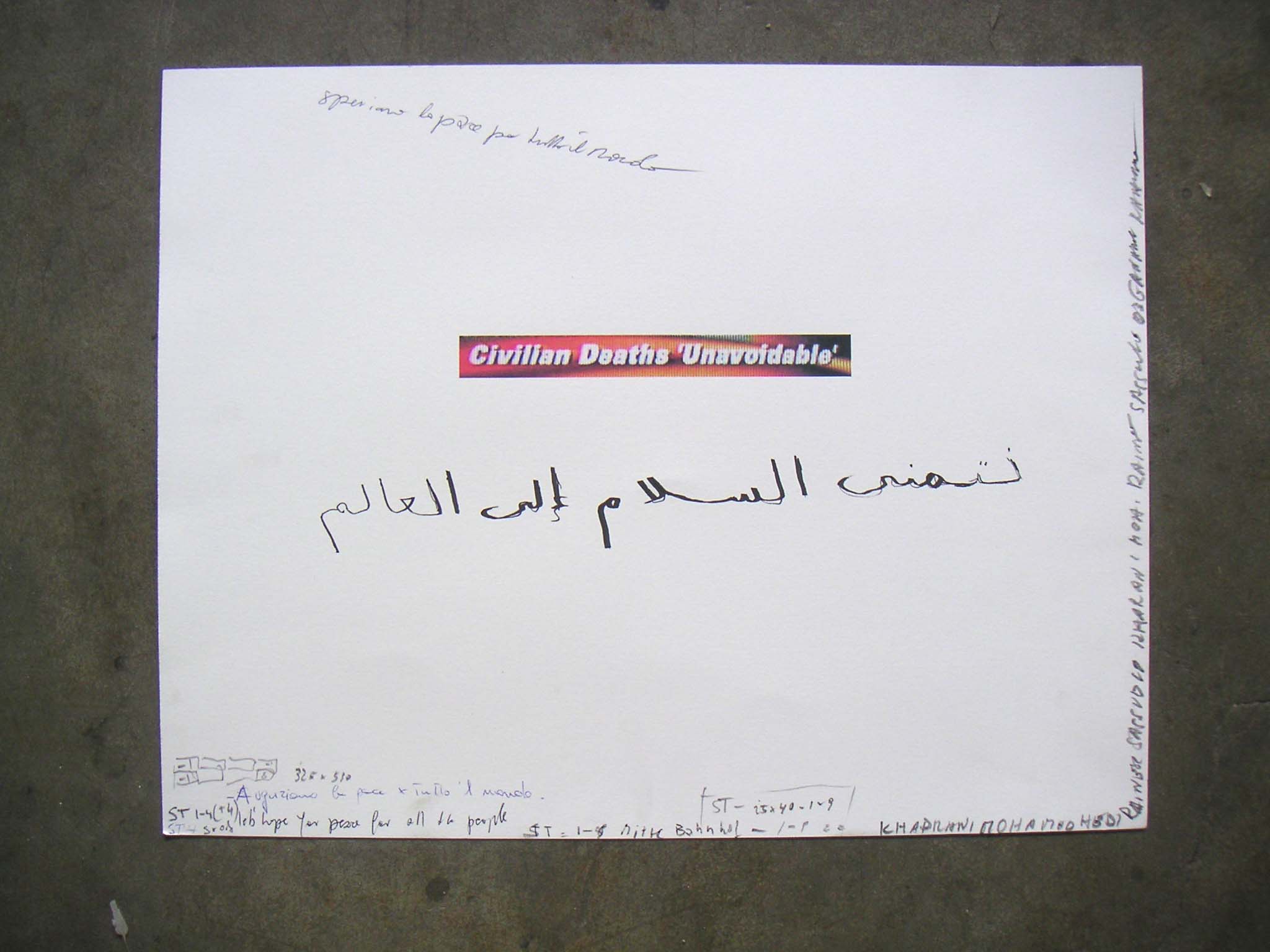 ARAB DIALOG WITH KHADRANI MOHAMED HEDI, CIVILIAN DEATH UNAVOIDABLE, 2003 Arabic text: KHADRANI MOHAMED HEDI; calligraphy: Siyam Mohsen; graphics: Silvano Rutigliano Translation by Siyam Mohsen: I hope for peace for everybody. Size: 75 cm x 120 cm x 1 cm, materials: ceramic tiles: 12 individual pieces of 25 x 40 x 1 cm, certificate of authenticity Hhadrani Mohamed Hedi works in a ceramic factory in Sassuolo and is from Tunesia. (ST)
