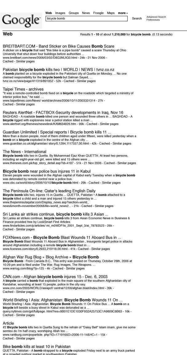 Google "bicycle bomb", 2006/07, detail - not complete)
