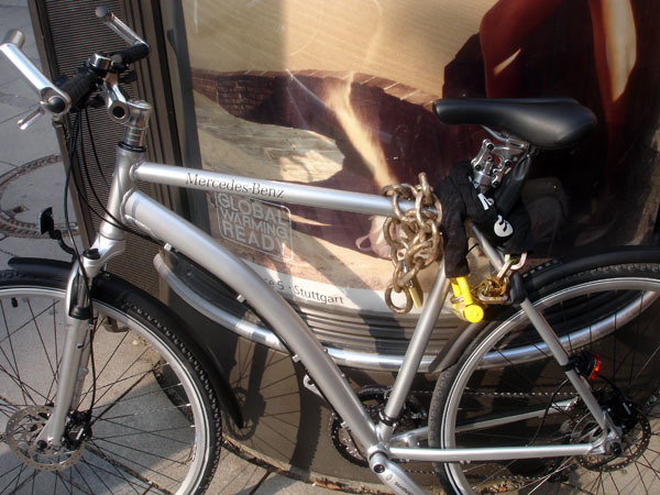 Don't steal my Mercedes Benz bike, 2006/07 (parked in downtown Stuttgart - this bike is in use by me - notice Diesels latest advertisment with 'global warming readiness') Mercedes Benz bicycle, bronze lock and kryptonite bike lock - this bicycle is in use by the artist.