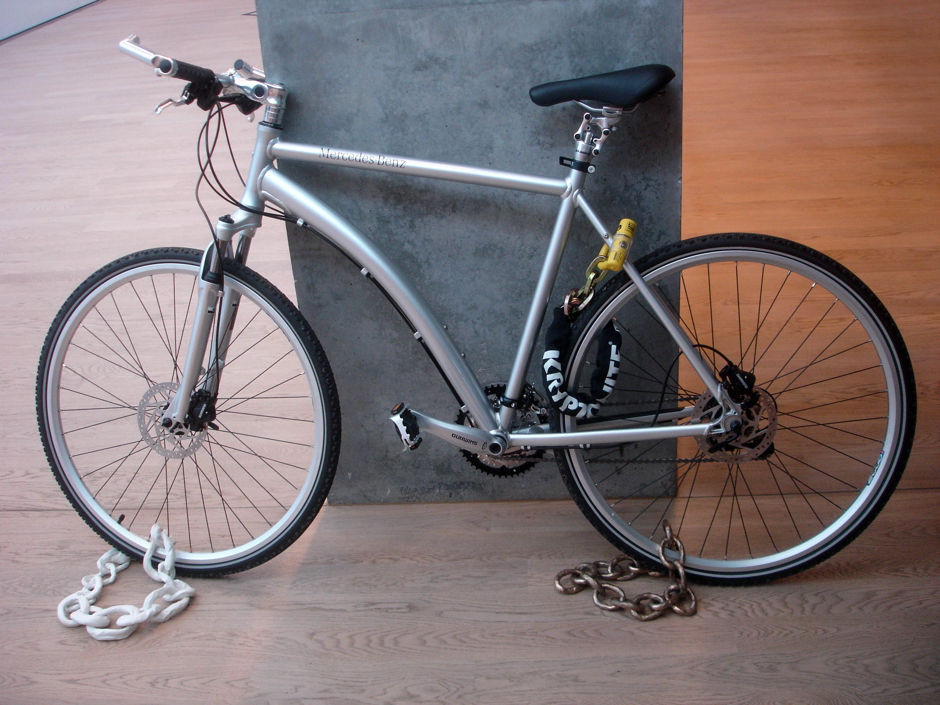 Don't steal my Mercedes Benz bike, 2006/07 (parked during the exhibition in downtown Stuttgart) Mercedes Benz bicycle, bronze lock and kryptonite bike lock