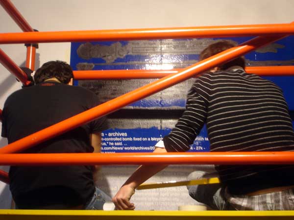 Google "bicycle bomb", 2006/0 (wall painting - in this case, the wall painting failed due to insufficiant wall consistency (for me it is not any problem since computers also fail sometimes when downloading a big file - now the thress stages of production for this wallpainting are visible: 1. application of venyl transmask stencil 2. application of black acryl paint 3 removal of mask 4 cleaning out of the remaining venyl. The Stuttgart walls are new and had only one coat of white wall paint which came down with step 3) click image for hi res picture