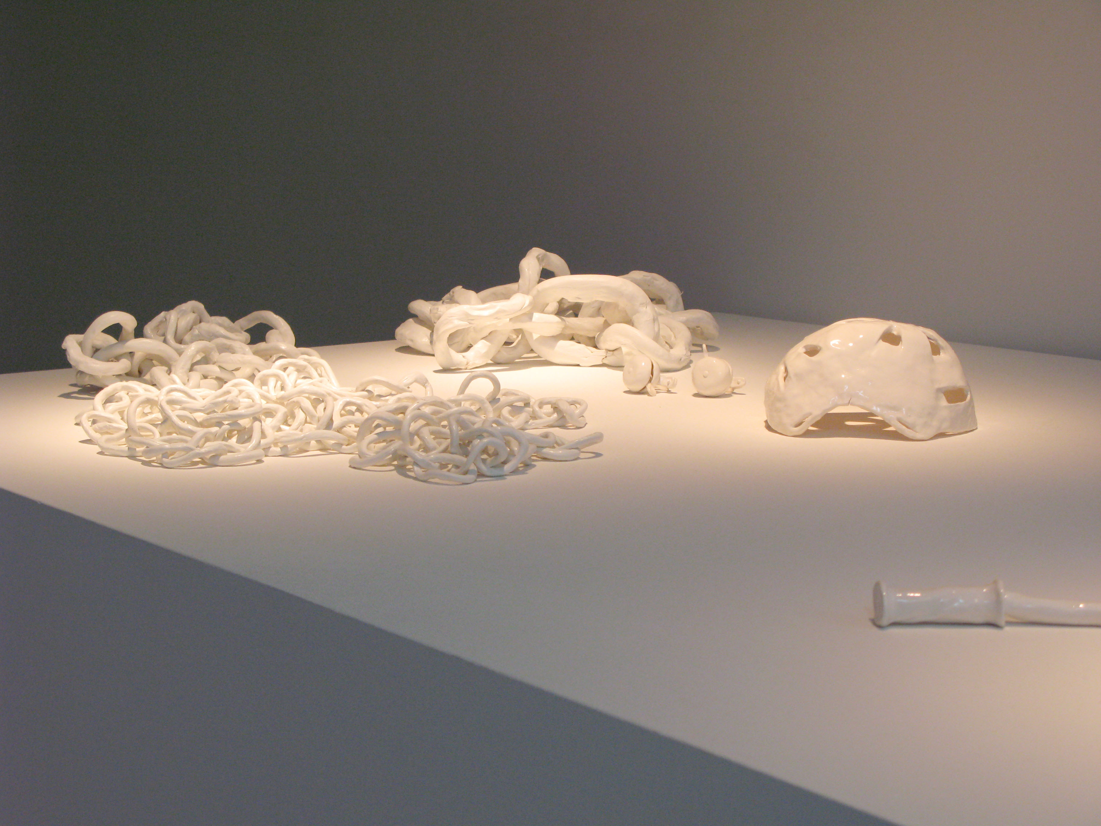 Bike bells, 2006/7 various porcellan chaines and steal loock, 1 bicycle helmet made of porcelan, and several porcelan bicycle bells., various dimeinsions click image for hi res picture