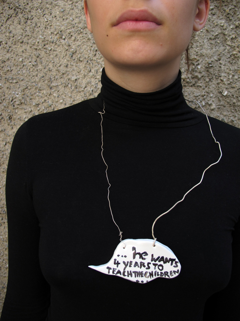 Tea party - Werkstadtgraz exhibition - the exhibition TEA PARTY - WITH MARX, LENIN, MAO, JARRY, TEA, T-SHIRTS, CHINA AND JEWELRY jewelry - neckless / necklace / bronze / porcelain / .... it is what it is... jewelry tea party - proper tea is theft .... drawings... and china Tea party readings - Monday - Marx, Tuesday -Lenin, Wednesday - Mao, Thursday - Alfred Jarry, Friday - Tristan Tzara, Saturday - Financial Times having proper tea .... with ... more FASHION :