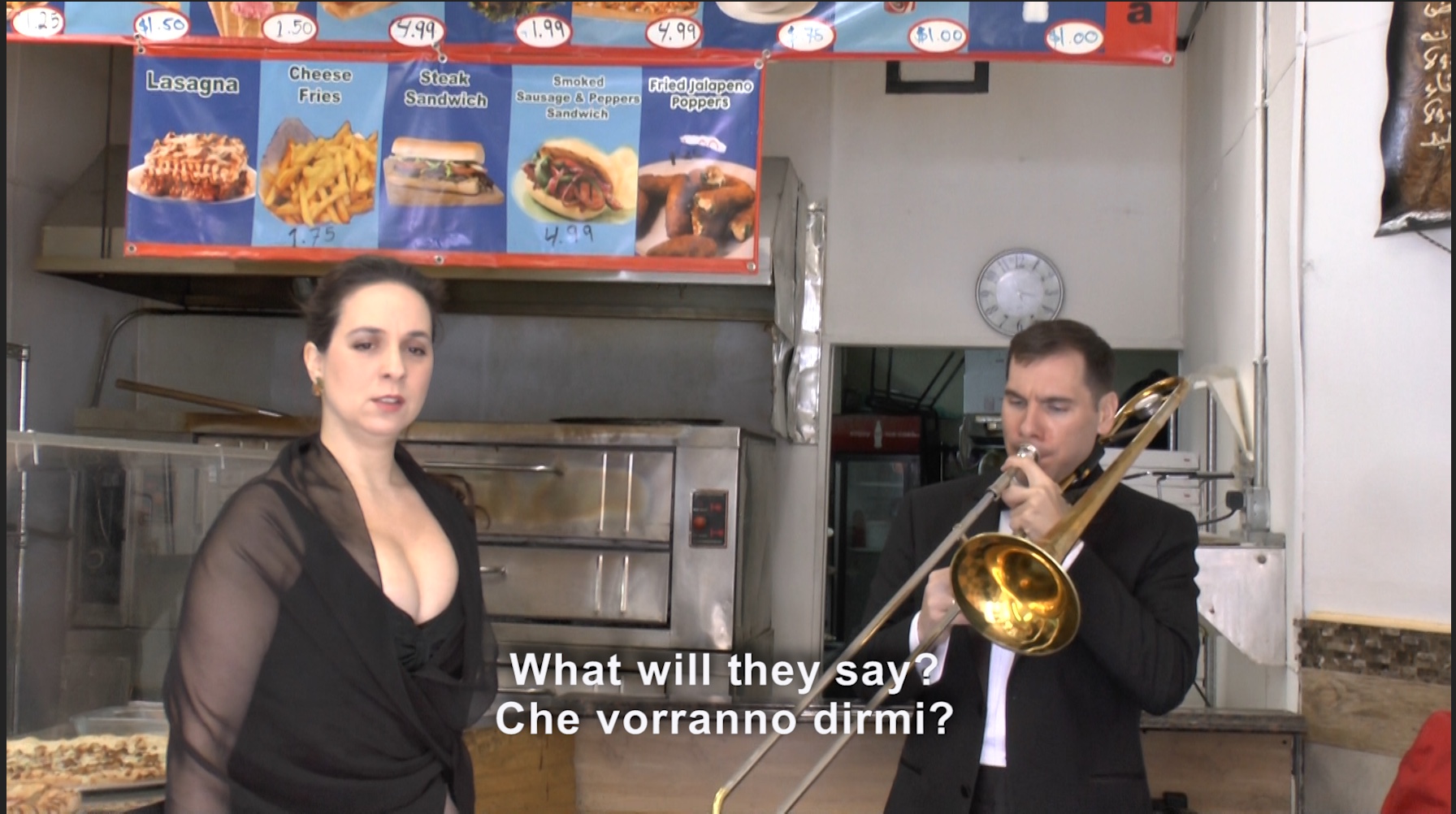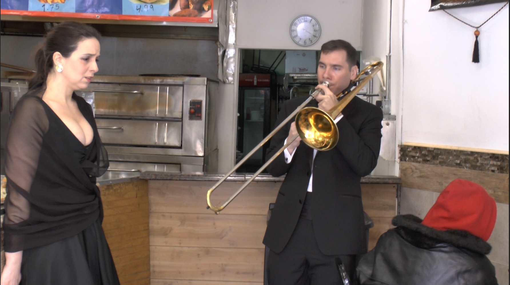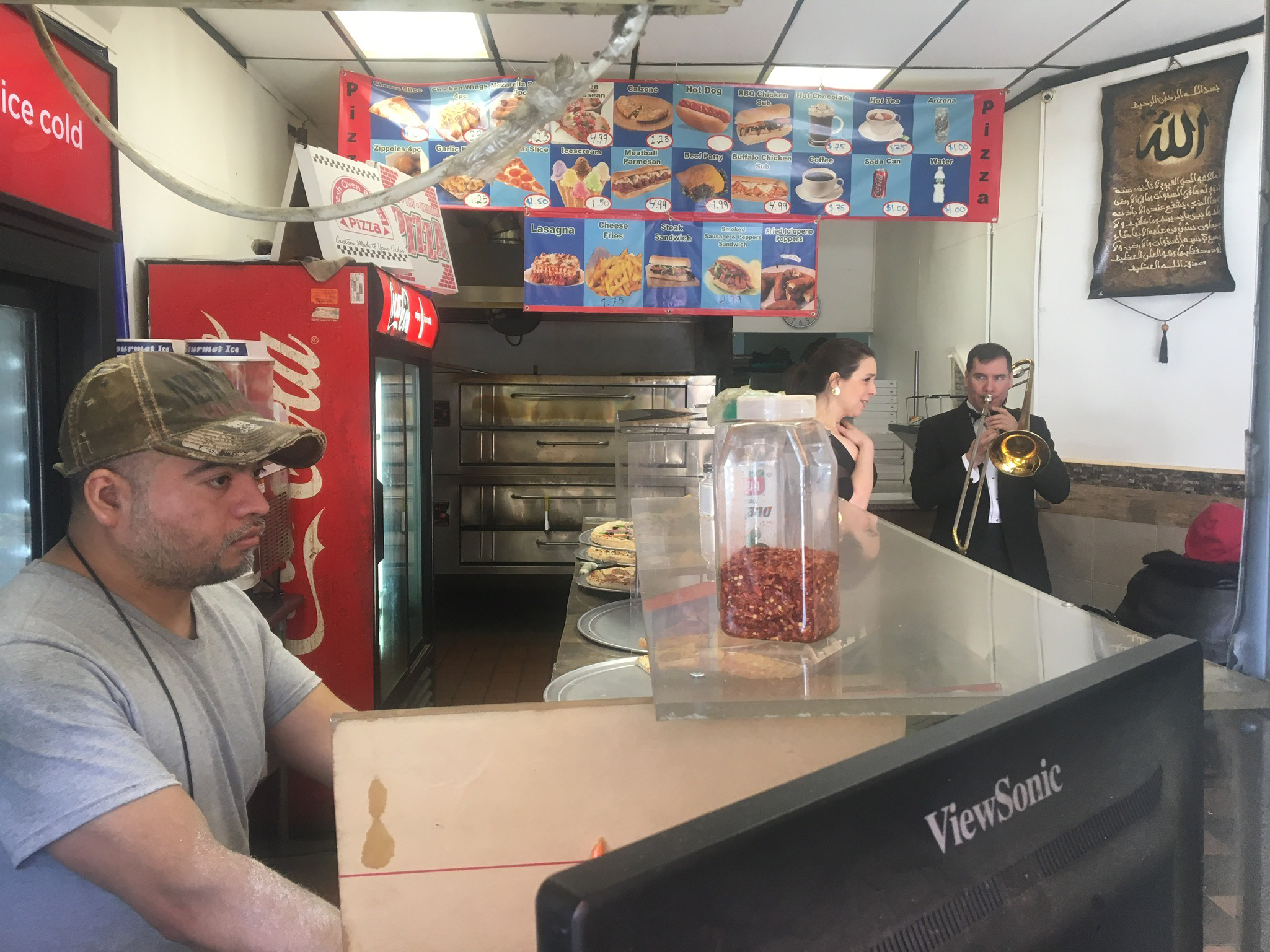 I cast the renowned Argentinian-born opera singer, Milena Dayen and the Canadian-born trombone player Mike Fahie to perform the piece in a $1-a-slice pizza parlor in Spanish Harlem. This local business is patronized mainly by a public that has been traumatized by the Immigration and Customs Enforcement (ICE) policies following Trump’s aggressive “America first” deportations, as if immigration has not always been at the core of American values. During the entire performance, a customer of African descent wearing a red hooded sweatshirt sat in front of an empty paper plate sipping on a can of Coca-Cola and occupied himself solely with his iPhone. This relatively new immigrant from Africa, who wanted to be anonymous, turned his back to the camera while we filmed.