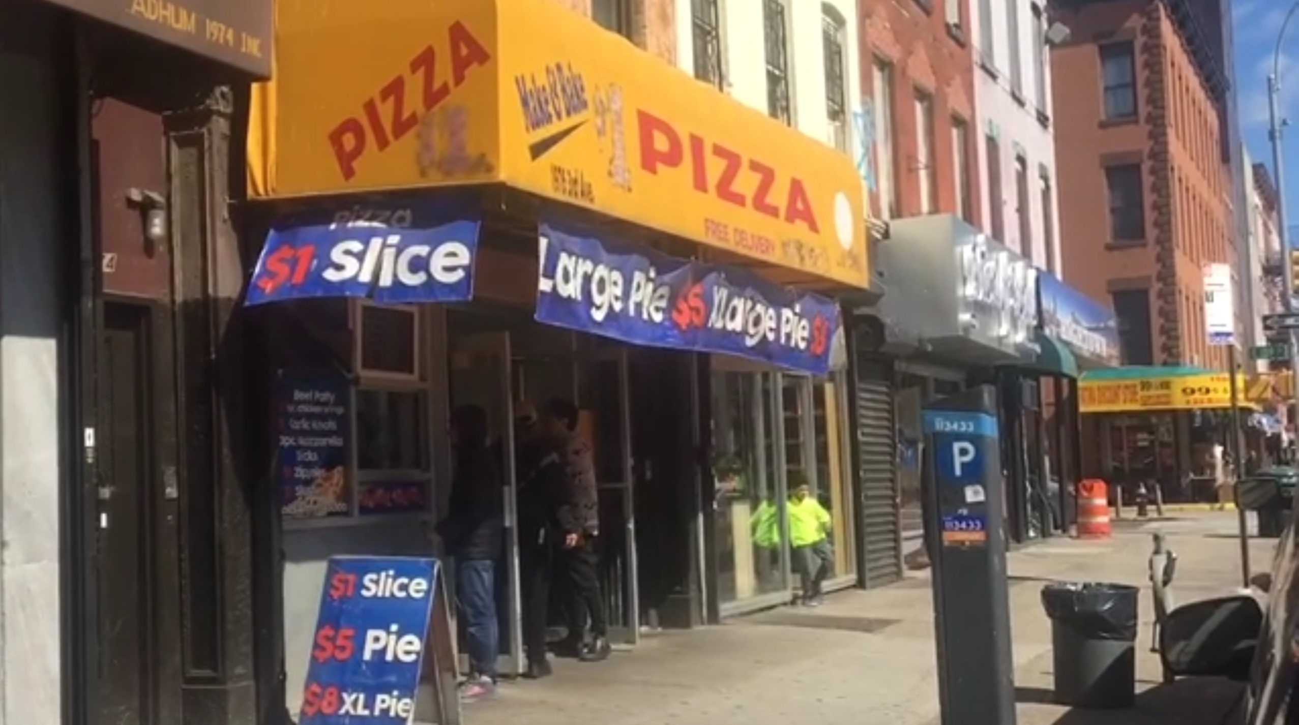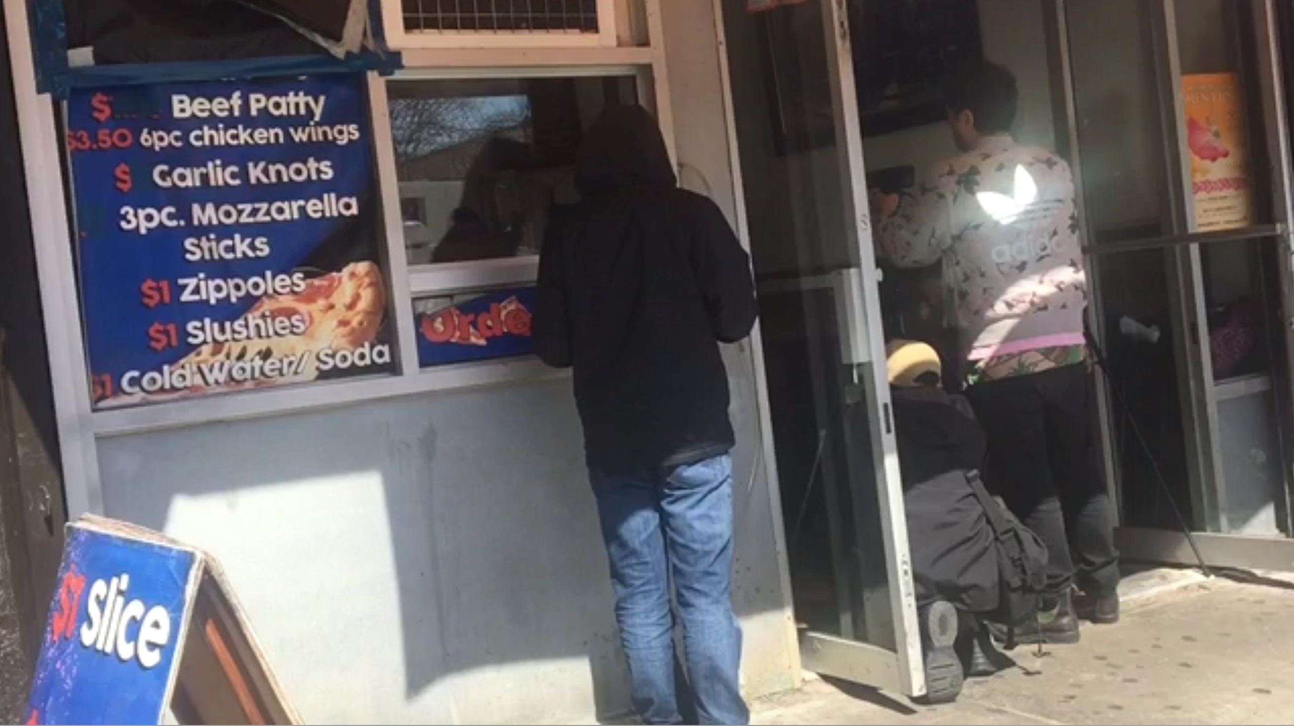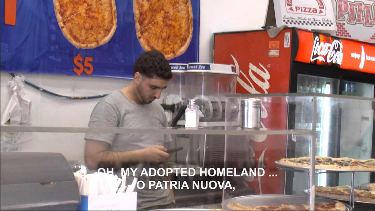 I cast the renowned Argentinian-born opera singer, Milena Dayen and the Canadian-born trombone player Mike Fahie to perform the piece in a $1-a-slice pizza parlor in Spanish Harlem. This local business is patronized mainly by a public that has been traumatized by the Immigration and Customs Enforcement (ICE) policies following Trump’s aggressive “America first” deportations, as if immigration has not always been at the core of American values. During the entire performance, a customer of African descent wearing a red hooded sweatshirt sat in front of an empty paper plate sipping on a can of Coca-Cola and occupied himself solely with his iPhone. This relatively new immigrant from Africa, who wanted to be anonymous, turned his back to the camera while we filmed.