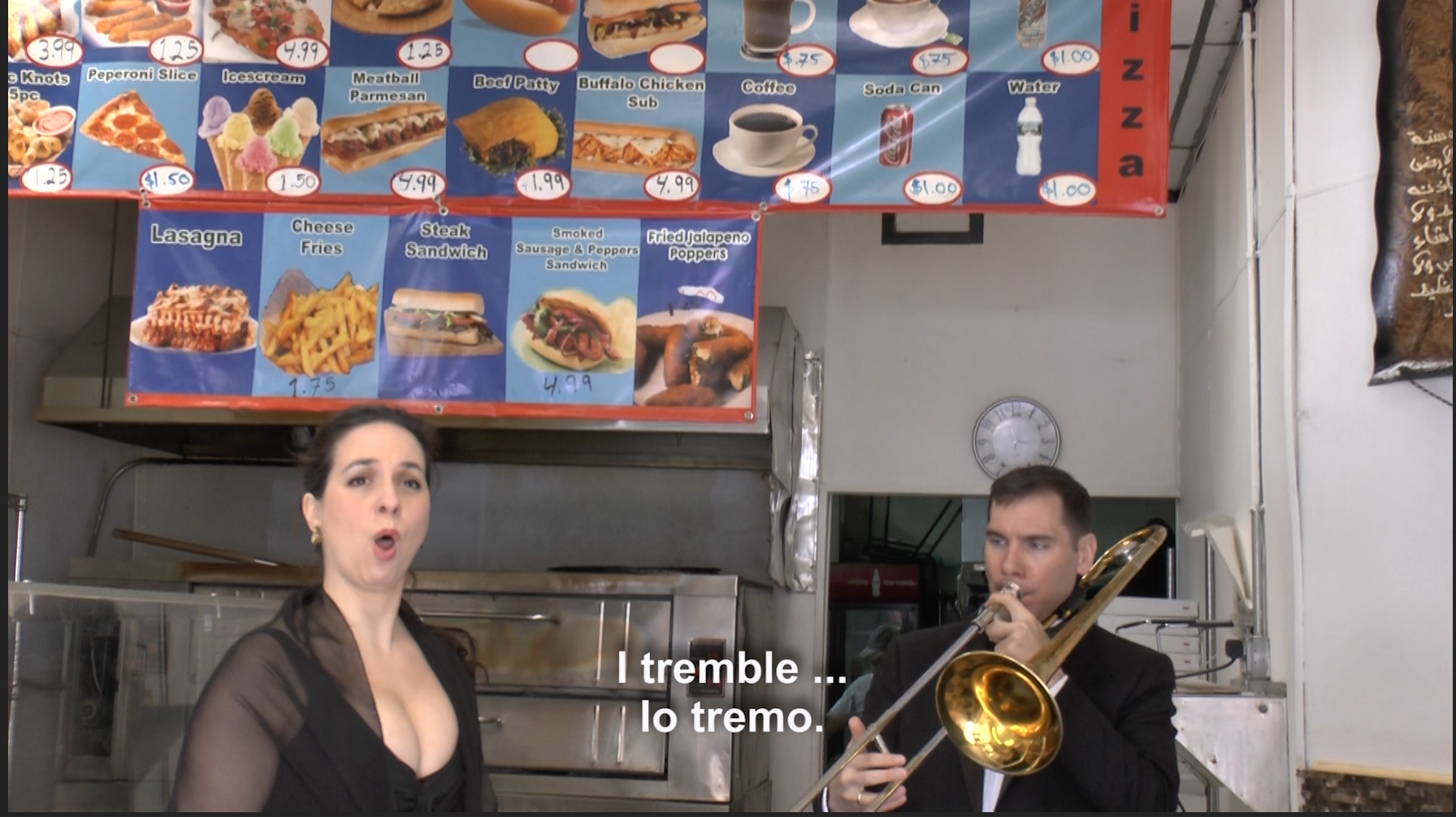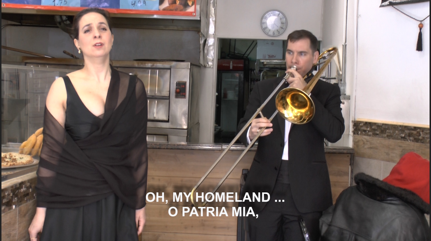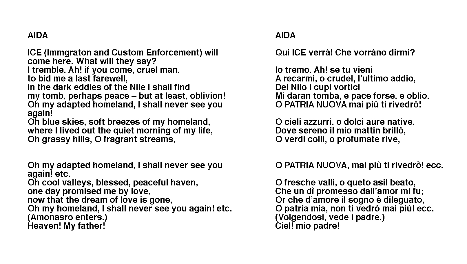 For the Wilhelma garden version of Aida, the expulsion and killing of Egyptian protesters by a repressive US-supported government served as the backdrop of the piece. Verdi’s libretto was appropriated without alteration and the singer sang only the aria “O patria mia,” a capella. The silence of the former palace garden added to the horrific circumstances of the first recording. The deporting villain in Aida, Radamès, was not named. For the Spanish Harlem pizzeria version, we changed Radamès to ICE, which has become under Trump a terrifying household acronym. Due to the Third Avenue traffic and street noise, we added a trombone player to guarantee the acoustical continuity of the piece and add a funereal quality to the music. And in fact for many people losing their adopted homeland, deportation can equal death.