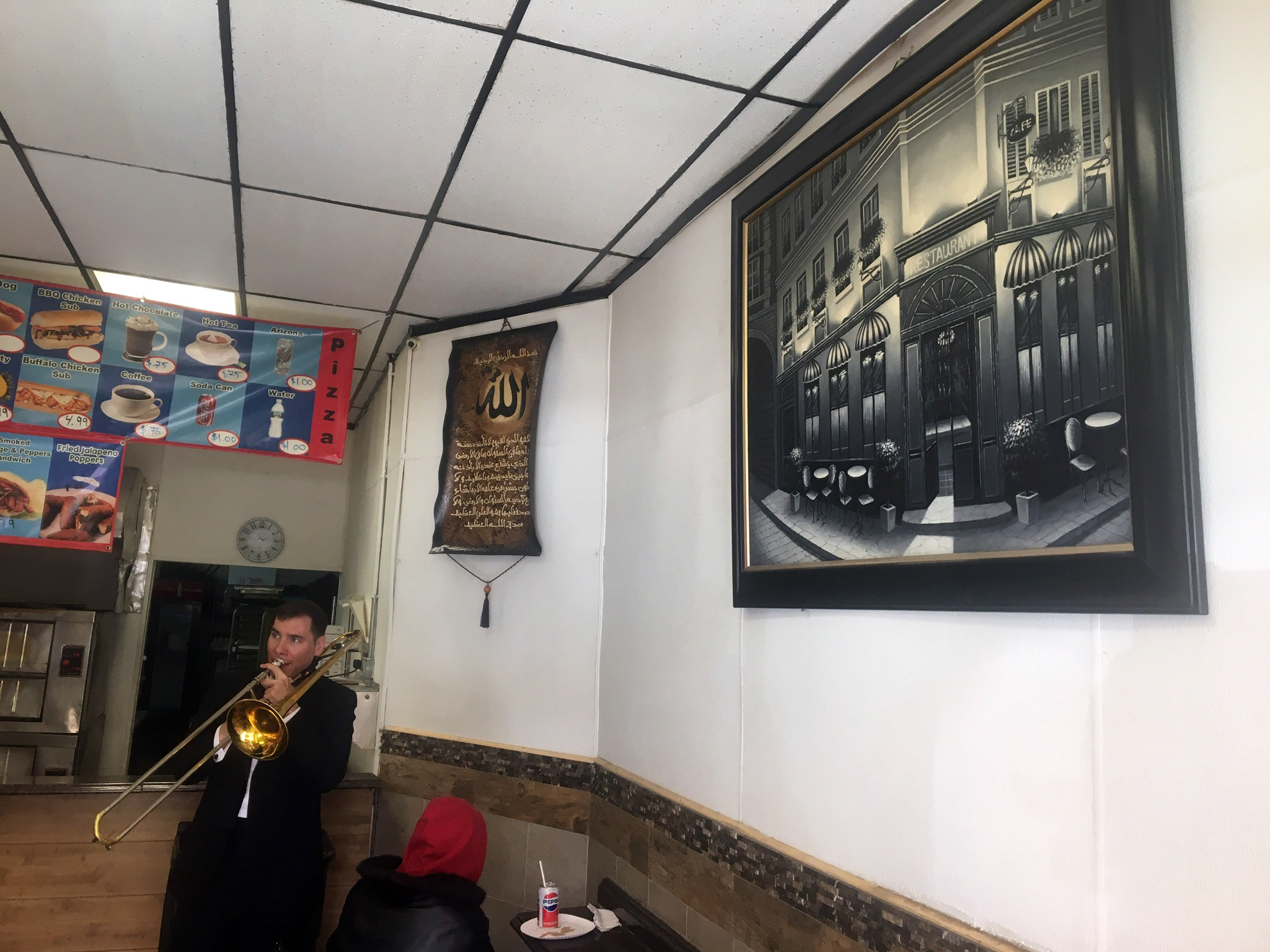 We recorded the piece while the pizzeria was open for business, in a neighborhood known to be one of the most diverse and economically deprived in the country. The owner of the pizzeria, who didn’t want to be named, is Jordanian and has an Arabic prayer poster hanging prominently behind the performers. His employees are new immigrants from Africa and Latin America with some who didn’t want to be recorded.