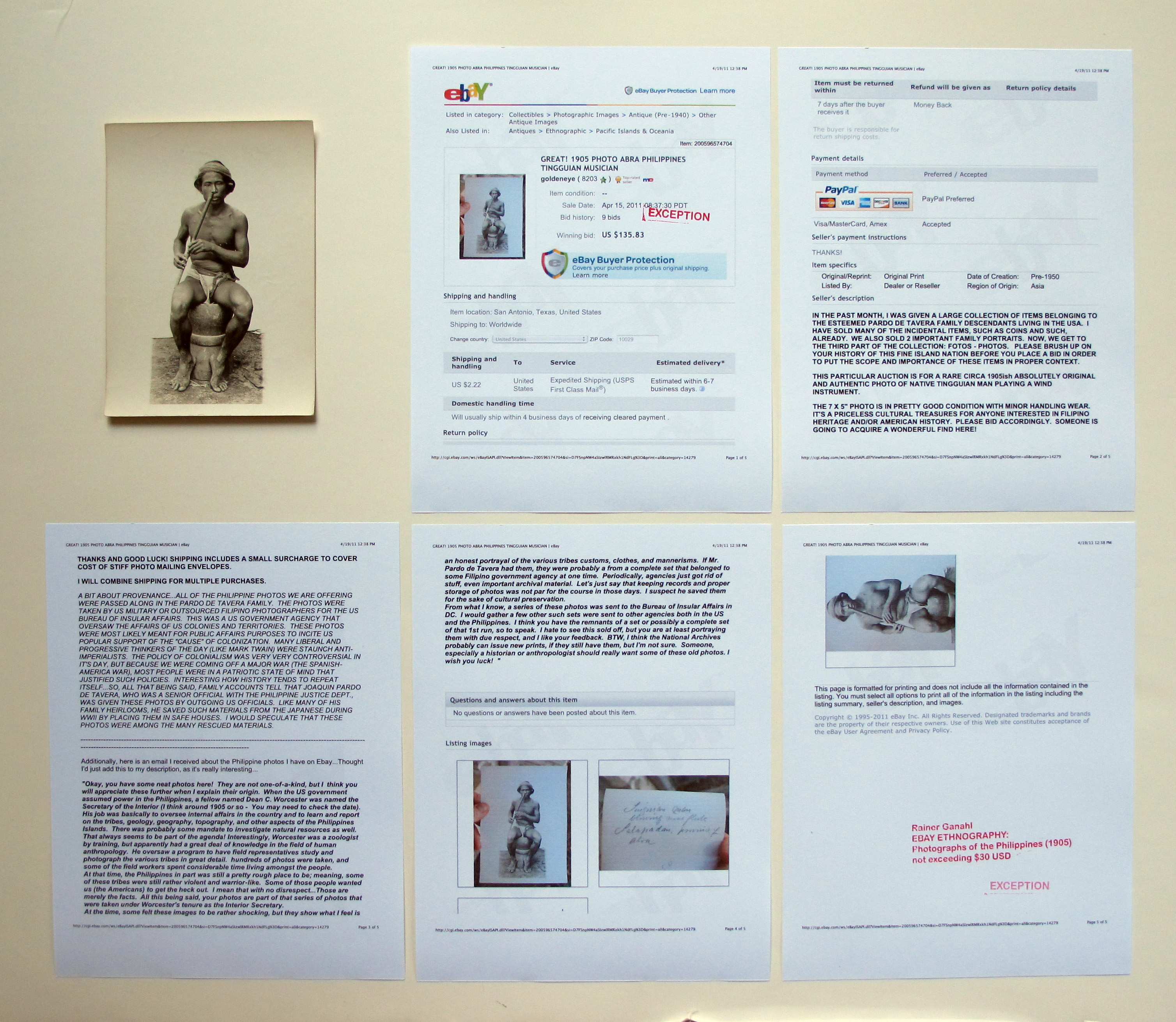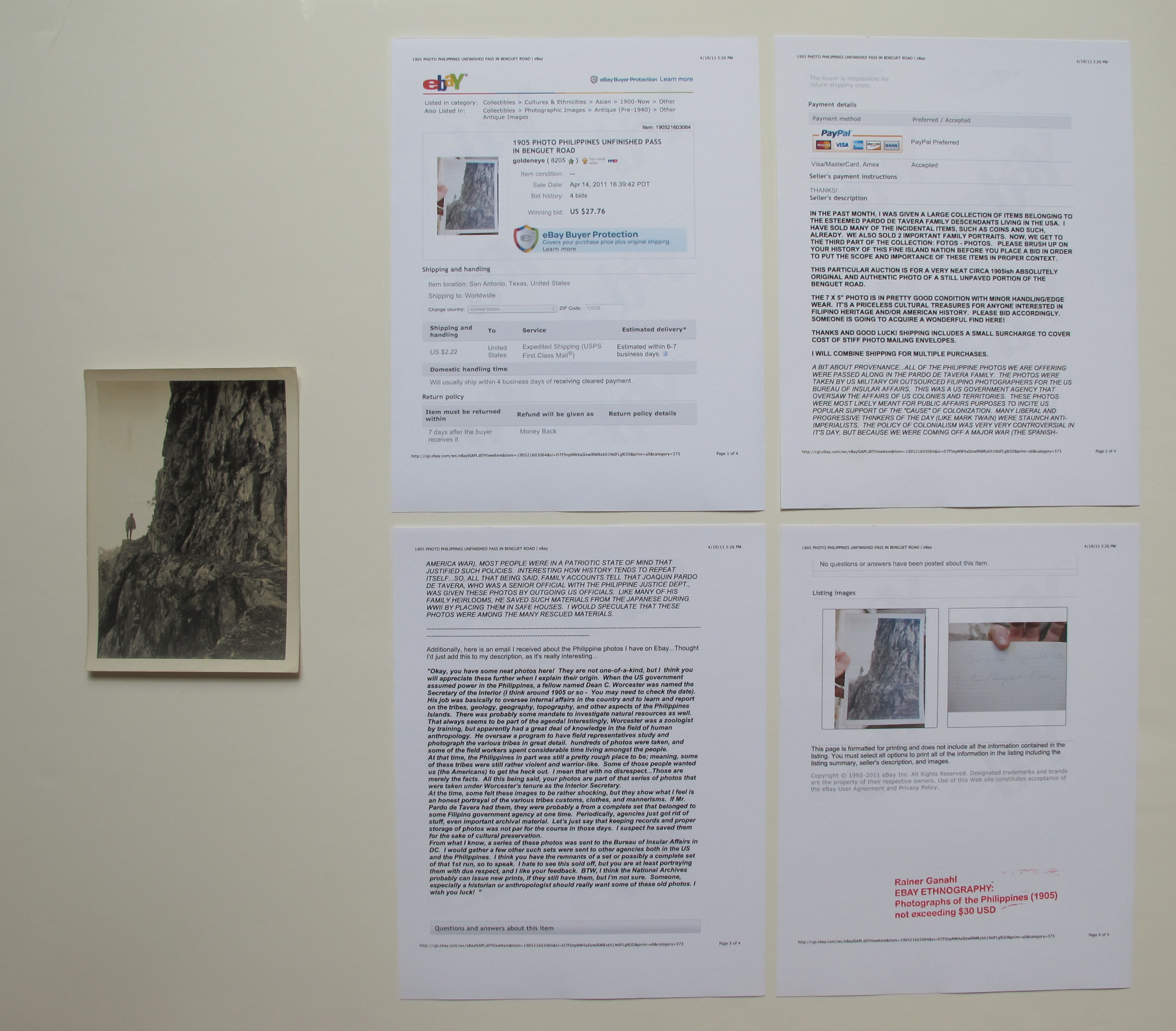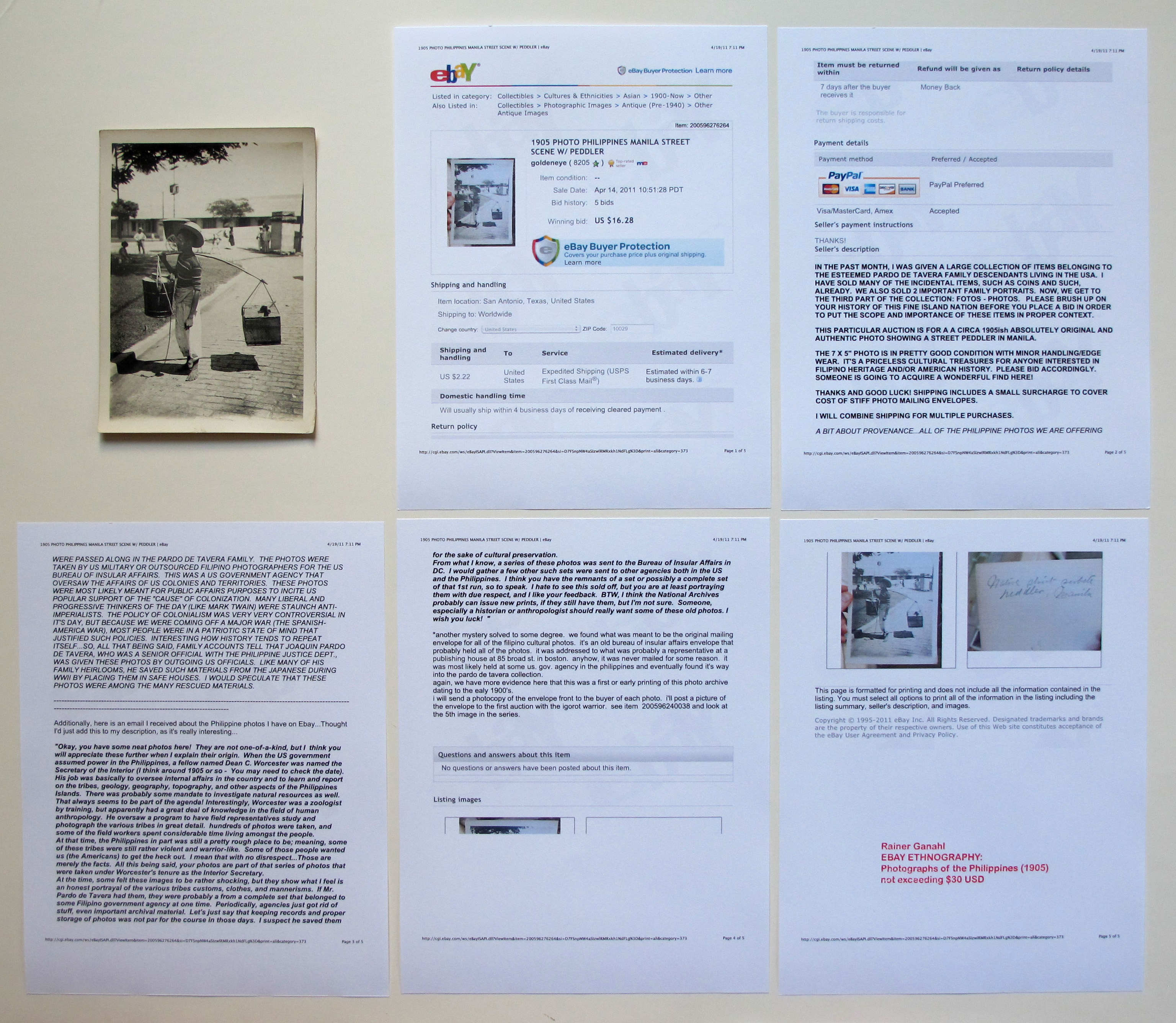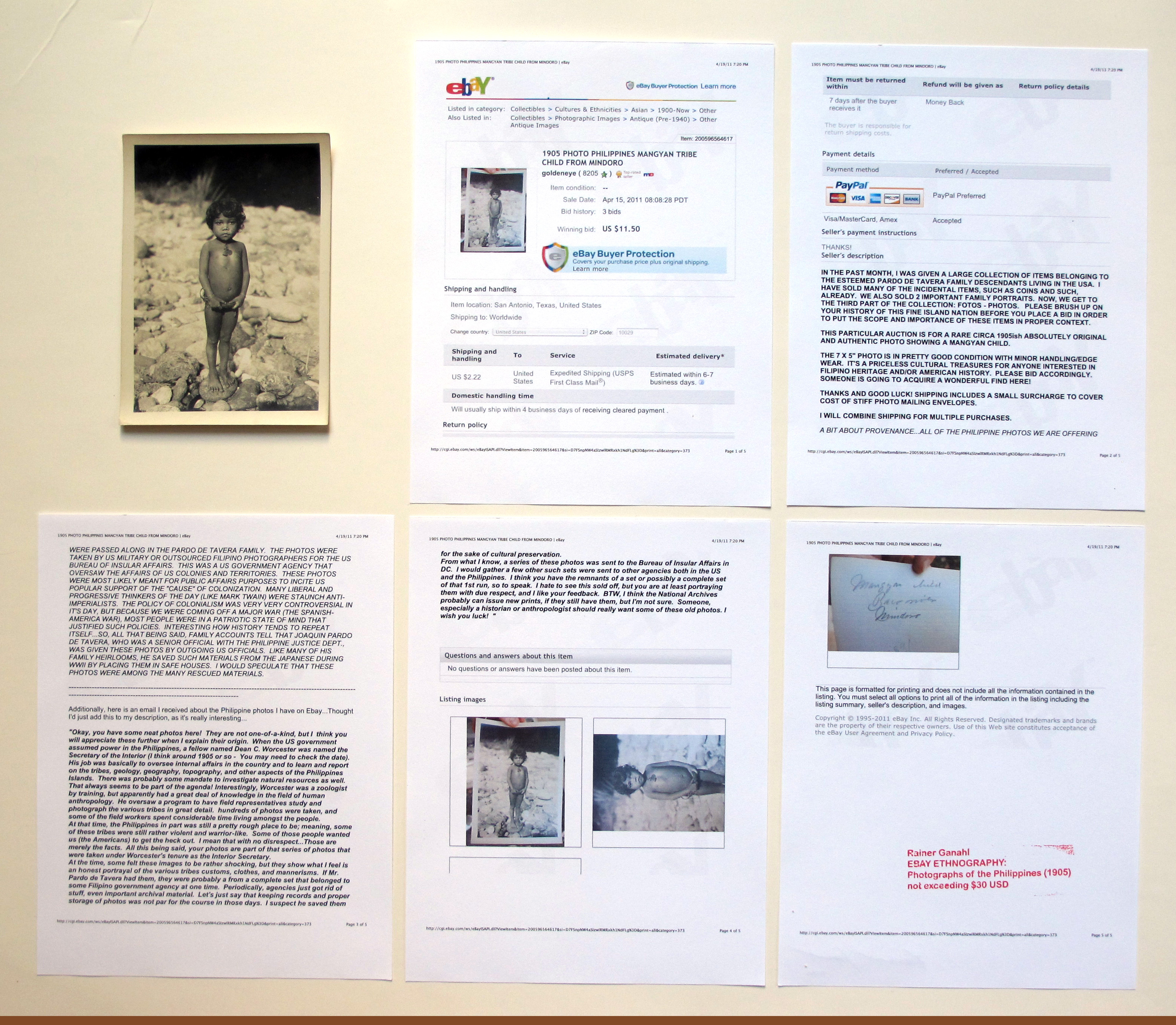 Shopping entered my art making through my interest in history. As somebody who spent 5 years in university engaged with historiography - I have come to understand that historical events were sedimenting (mostly) as kitsch in antiquarian shops, flee markets, and today, massively on various internet trading platforms. For years I have been using things I purchased over time. (see more : shopping) I also sometimes direct my artistic research right on the net or on auction houses. Here is a special series of photographs I came across on ebay: read the sellers descripition of the items. The original photographs and the related ebay paper works are combined for individual works with the title EBAY ETHNOGRAPHY, Photographs of the Philippines 1905, not exceeding $30 USD.