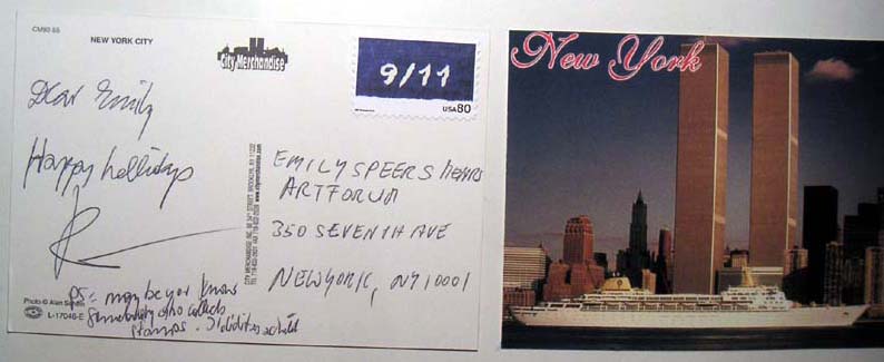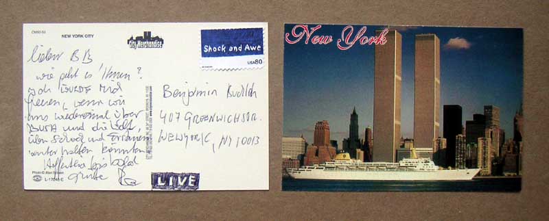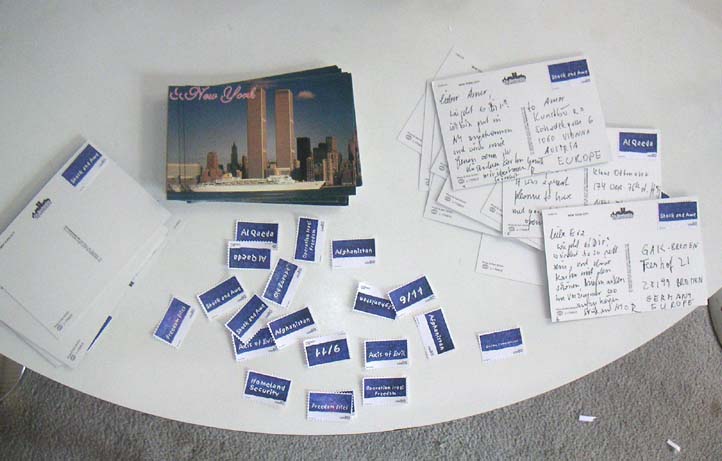 postcards sent to KUNSTBUERO, vienna -0 where I m currently havng a show.. saying: schoene gruesse aus new york. (happy greetings from New York_) MOST CARDS WERE ACCEPTED AND DELIVERED BY US AND AUSTRIAN POSTMASTERS