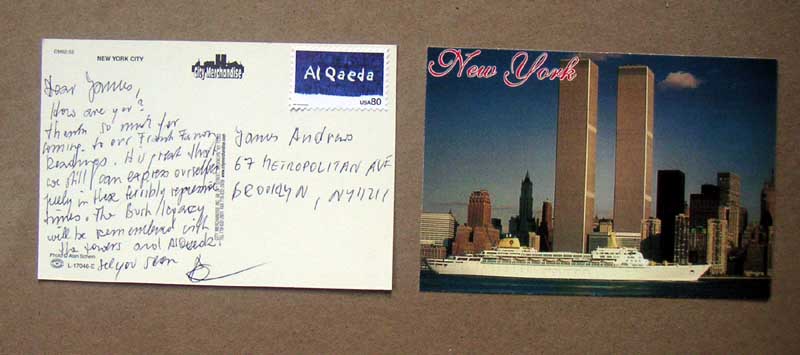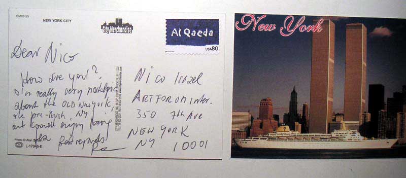 Dear Stephan, How are you? We saw these towers fall together - you glued to the TV - me in and out to the streets, even within a few blocks with the bicycle. Unfortunately, this miserable illegitimate Bush administration has only managed to turn half the owrld into an US-hating pool of terrorism .. too sad . see you soon R CARD WAS ACCEPTED AND DELIVERED BY US POSTMASTER