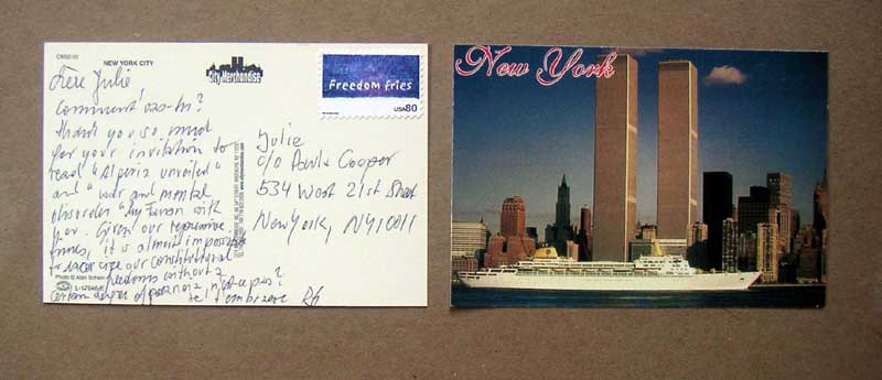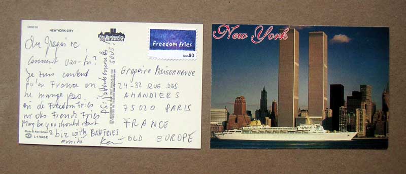 cher gregore, comment vas-tu? je suis content qu'en france on ne mange pas de freedom fries, ni des french fries. may be you should start a biz with Bush-fries. amitie rainer ps: j attends les sous! daer gregoir, how are you. I am happy that in France nobody easts Freedom fries, nor French fries.. May be you should start a biz with Bush Fries. amities.. PS: I am waiting for the money! CARDS WERE ACCEPTED AND DELIVERED BY US AND GERMAN POSTMASTERS the stamp was removed