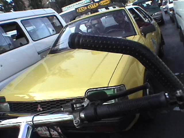 BICYCLING DAMASCUS, 2004 - 90 min Bicycling Damascus is my second video - after Bicycling Tirana - for which I visit a city with a bicycle. I bicycle against the traffic while filming without holding the steering wheel. I drive for 90 minutes around this ancient city filming directly across the steering wheel thus rendering it into cross hairs. This brings me through a variety of different neighborhoods and places that give a cityscape quite surprising to see. This risky and unlawful engagement with the bicycle, the city and my camera creates an anti-gravitational epic of traffic jams, busy people and a colorful middle eastern street live in a country, the US State Department considers to be involved with terrorism and weapons of mass destruction. (Syria indeed does have very bad human right reports and still has to come to terms with the massacre of Hama, a rebellious city where president Assad ordered 1982 the killing of around 40.000 inhabitants.) The bicycle is not only my unique vehicle of transportation but also my urban eyeglass - some extension of my visual and acoustic organs. As such it is a real social urban interface. I'm a bicycle rider since early childhood. My first birthday present I remember was a bicycle. I have never stayed in a place for long without a bicycle, including in Tokyo where I was harassed daily by the police for riding a bicycle. (I was considered a bicycle thief). The bicycle I used in Damascus was lent to me. I hired it for half the price of a new Syrian bicycle. The bicycle was lent to me by a tailor. Syria has a beautiful domestic bicycle production. They all look the same but don't even function as new one's in the shop. The more useable bicycles are now imported from China. (I hope I don't offend anybody with my comment but unfortunately, that was my experience: Ii fell in love with the local 'every body the same bicycle' but I came to understand that it was nearly impossible to ride them, nothing functioned properly - that kept me from buying one, from exporting one) A part from this lousy = expensive = lending practice, the bicycle lent to me was very bad. Not only did it have barely any breaks but also, the bicycle was shaking to the point of ...me falling off. It took me about one hour to get used to it. Riding without holding the steering wheel requires a bicycle that is stable and predictable, in particular if one drives dangerously. This bicycle was shaking nonstop and performed quite dangerously. I had a couple of quasi-accidents and falloffs. In the end I survived.. - voila la video (close window to return) (an extract of 3 min - the total is 90 min - unedited)