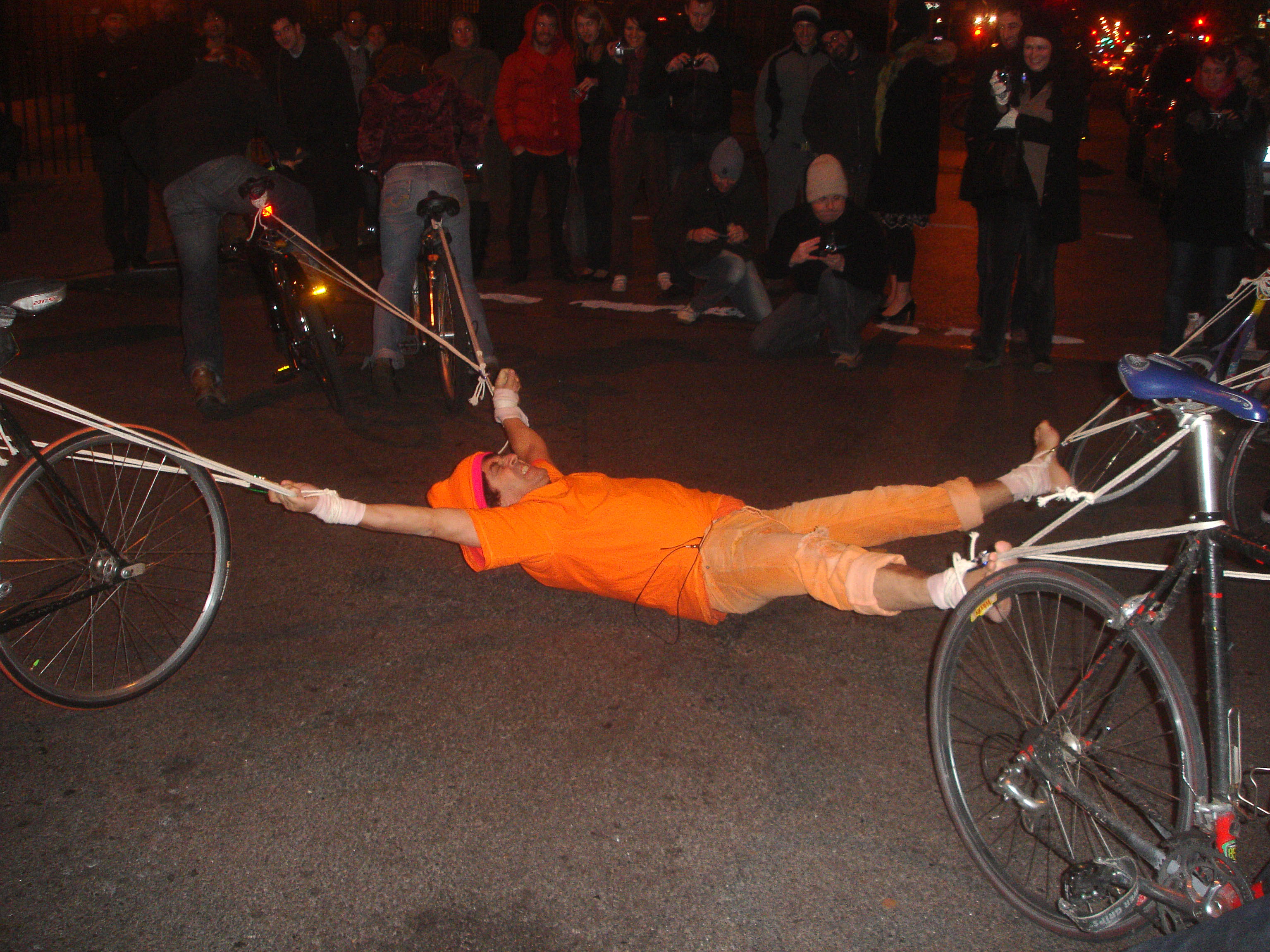 Rainer Ganahl, Bicycle Quartering, 1757/2007 performance "Finally, he was quartered, ... this last operation was very long, because the horses used were not accusmed to drawing; consequently, instead of four, six were needed; and when that did not suffice, they were forced, in order to cutoff the wretch's thighs, to sever the sinews and hack at the joints ..." Gazette d'Amsterdam, 1757 in: Michel Foucault, Discipline @ Punish, The Birth of the Prison, 1977 For this performance, I was attached by rope to four or eight or even twelve bicycles which were trying to pull me into four pieces in the middle of a street crossing in downtown Manhattan blocking car traffic for a couple of mintues. This should be a reminder that torture is practiced today by the current Bush administration in relationship to their “war on terror” over resources that wouldn’t be needed if people used bicycles and not cars. Performance site: intersection Stanton and Eldrige Street, Manhattan, November 16th, 2007 from 9 30 pm This was part of PERFORMA 2007 / IN THE CONTEXT OF SNÖRFRIED