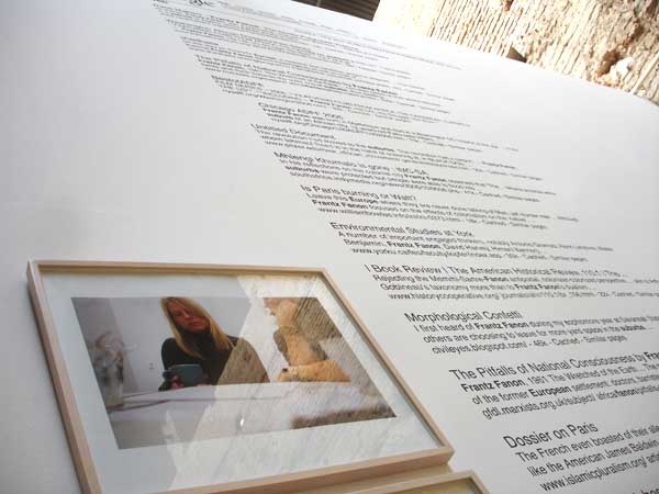 installation view, detail installation detail with Reading Frantz Fanon (Pariis, 2002, Utrecht 2002 photos 51 x 62 cm each) and Searching "Frantz Fanon European suburbs" on Google.com", (450 m high) 2006 click for downloading hi res image
