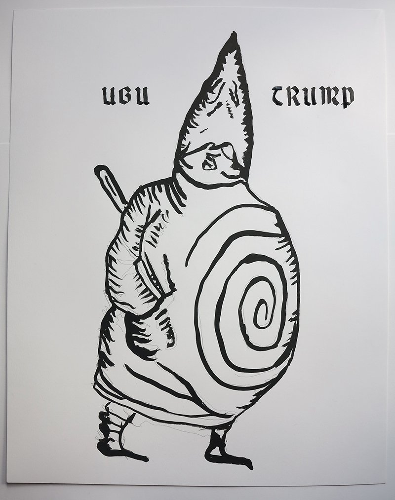 UBU TRUMP Alfred Jarry first presented his absurdist, expletive-filled play King Ubu in Paris in 1896, and instantly ignited a literary scandal. King Ubu not only influenced artistic movements such as Dada, Surrealism, and the Absurd Theater of Jean Genet and Samuel Beckett, but it anticipated, with frightening perspicacity, the catastrophic political madness of the 21st century. Written in a rudimentary and comically nonsensical way—it even incorporates some of Jarry’s high-school stunts—the play lends itself to updating with contemporary slang and subjects. About 10 years ago, Rainer Ganahl rewrote Jarry’s text as Ubu Lenin, with Vladimir Lenin and his wife Nadezhda Krupskaya as the protagonists. Now, the advent of Donald Trump has presented an even more appropriately divisive, madcap, narcissistic stand-in for King Ubu. Ganahl's Ubu Trump will take place in Harlem, a neighborhood filled with many of the very people Trump supporters would like to see deported, banned, or put behind “big, beautiful walls.” Just like Jarry’s King Ubu, Trump and his cronies run their administration like a mafia family business, with barely fig-leafed personal enrichment schemes layered upon corrupt policies and, in all likelihood, treason. In Ubu Trump, the father, King Ubu, has been replaced with Ubu Trump, while Mama Ubu is reincarnated as Ubu Ivanka. Originally set in Poland and Russia, the new play blends Warsaw with Washington, and Poland with the USA, alluding to Trump's special dealings with Putin and the new right-wing government in Poland. The actors perform behind three simple graphic panels based on Jarry's own sketches of King Ubu, and overlapped with renderings of the ruling Trump family: Donald, Ivanka, Jared, and their Russian guest, Putin. This theatrical performance will be staged at a morgue in Harlem, the neighborhood where Ganahl has been living for more than 20 years.